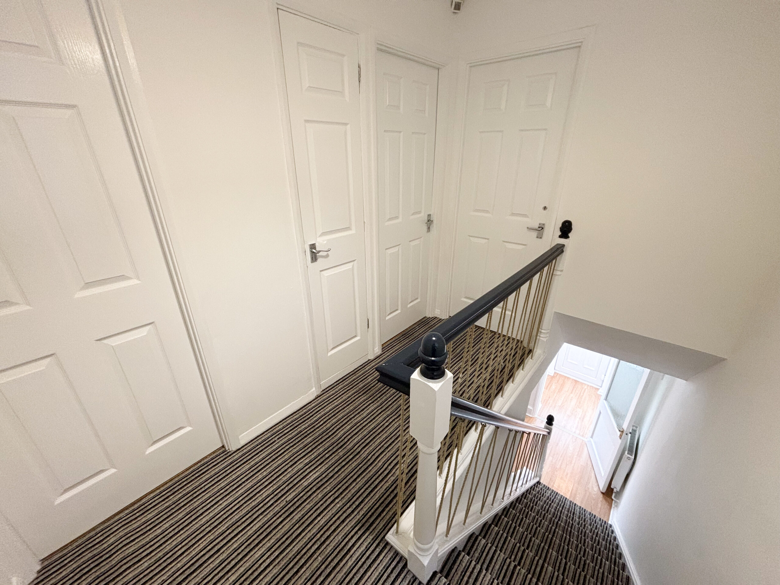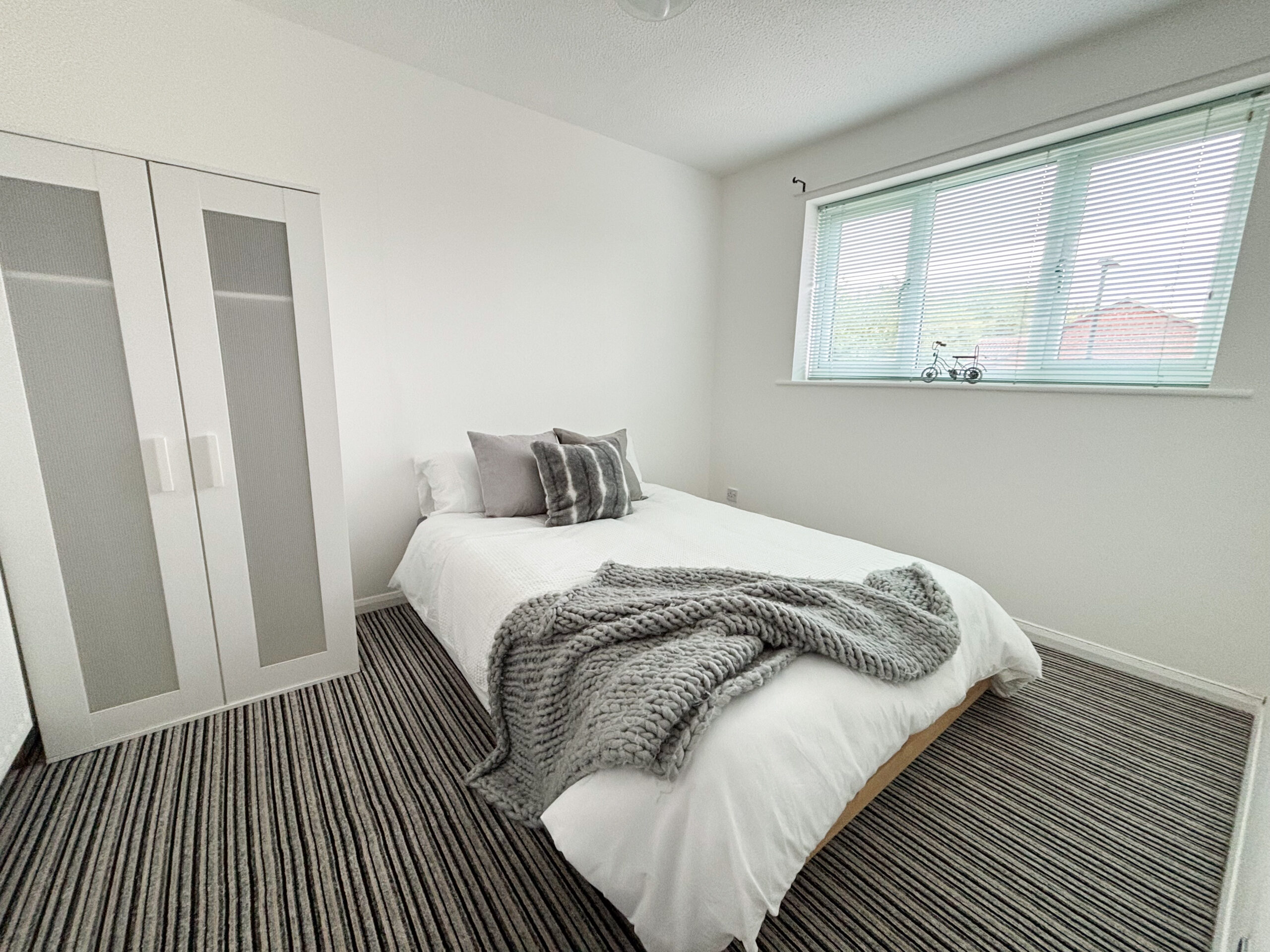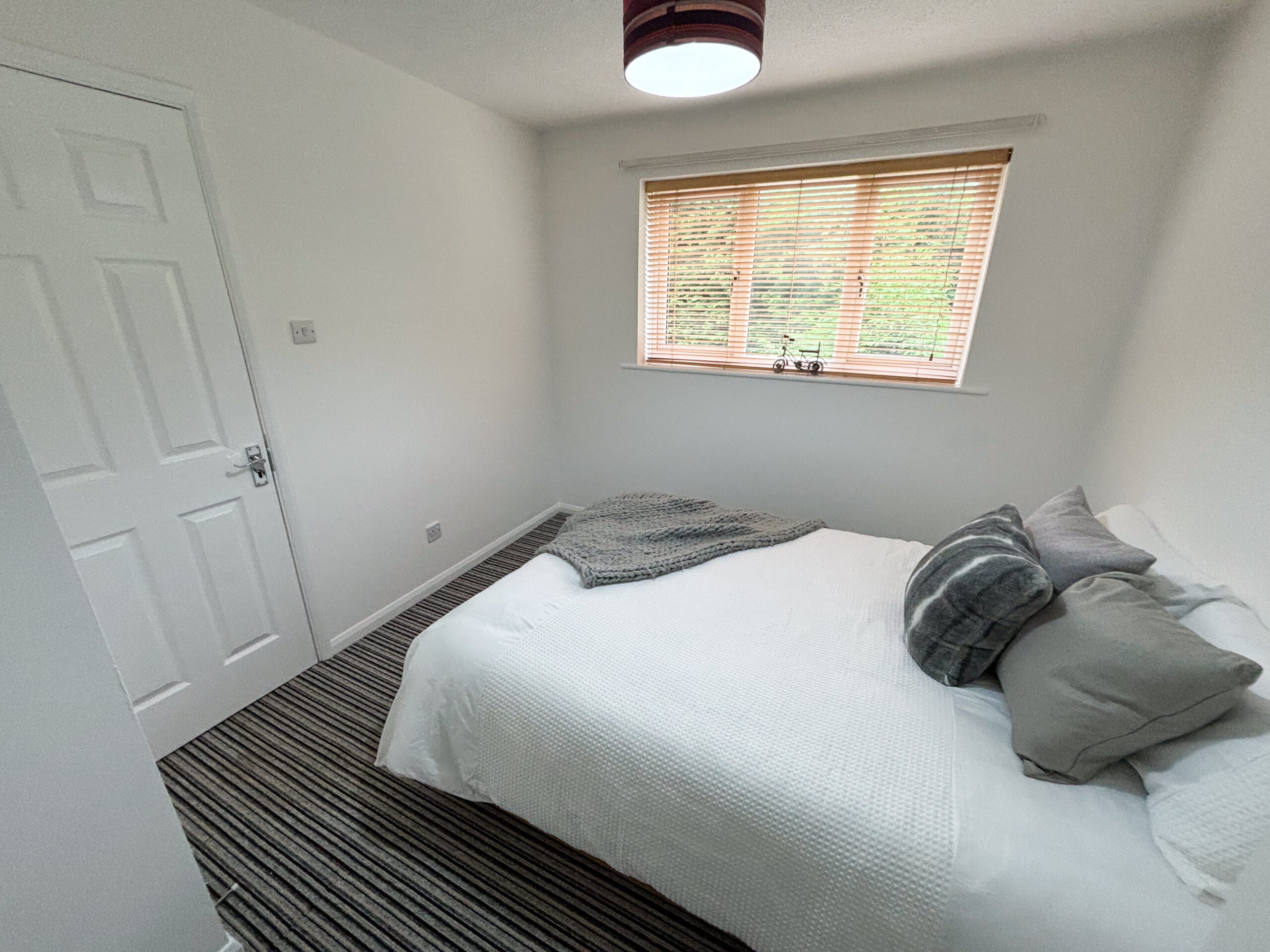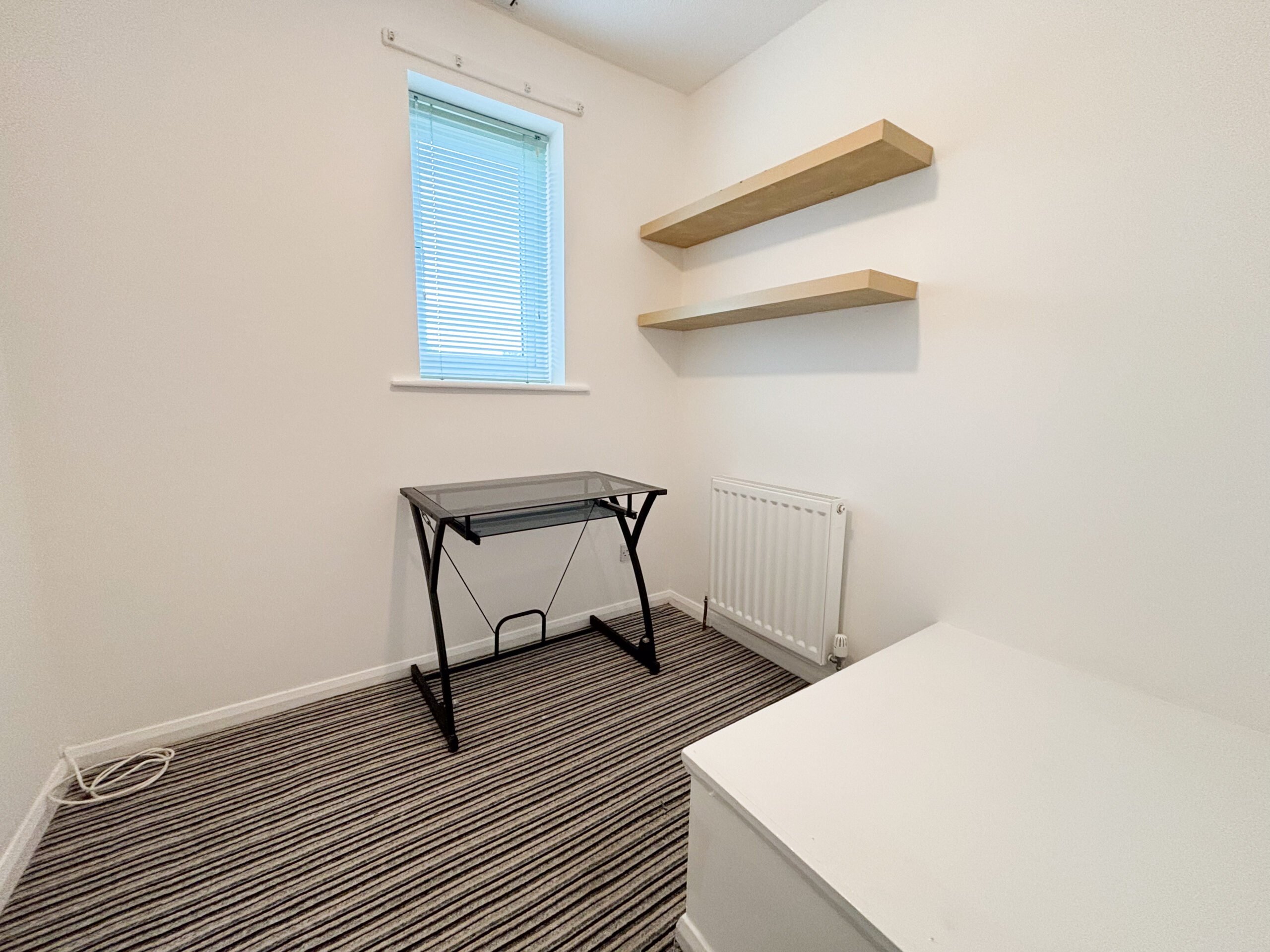 A good sized, neutrally decorated, light and airy medium room situated on the first floor with a large window looking out over the front of the property. It contains a wardrobe, double bed with storage underneath, desk and chair, with newly fitted stripped carpets.