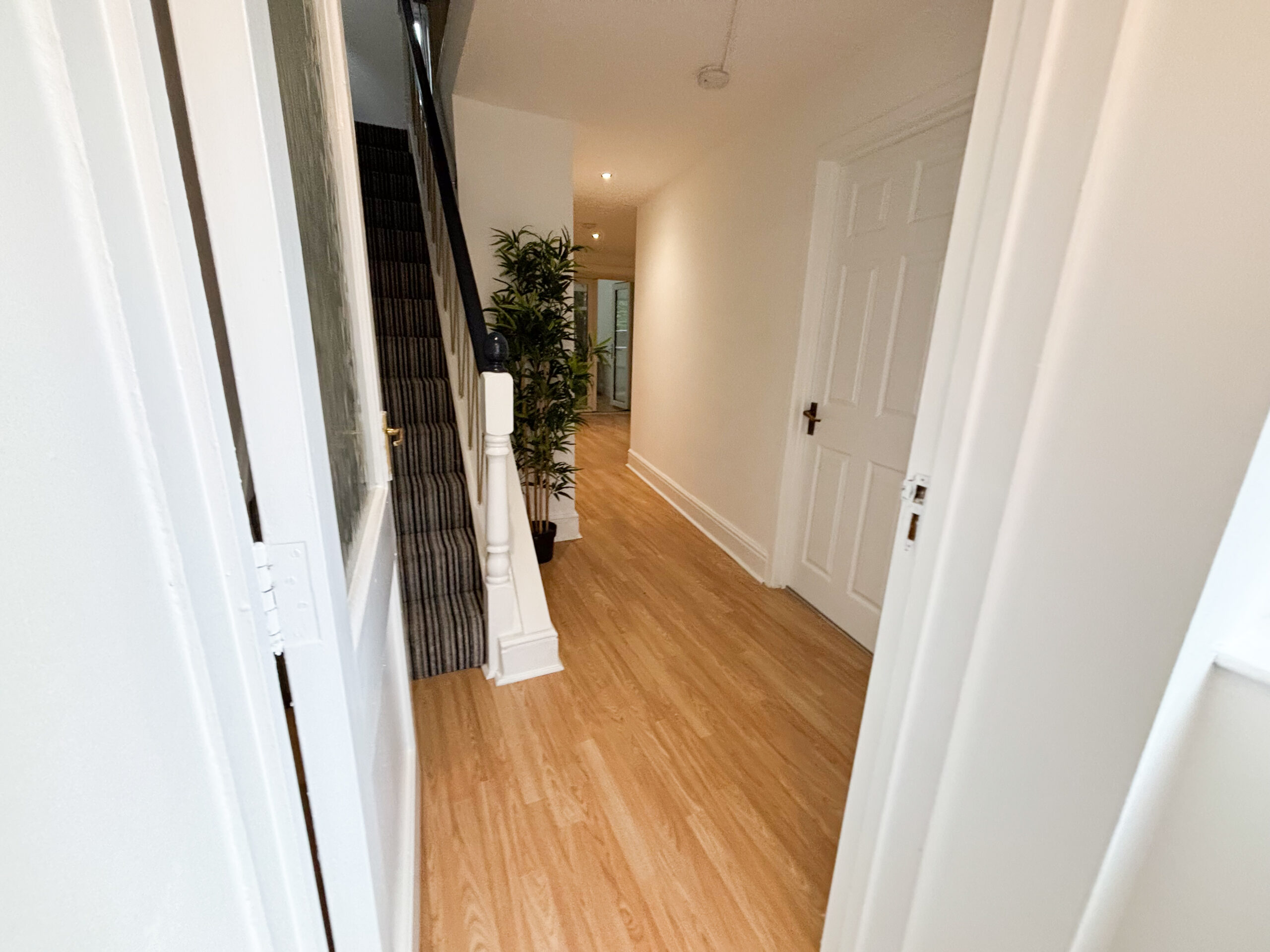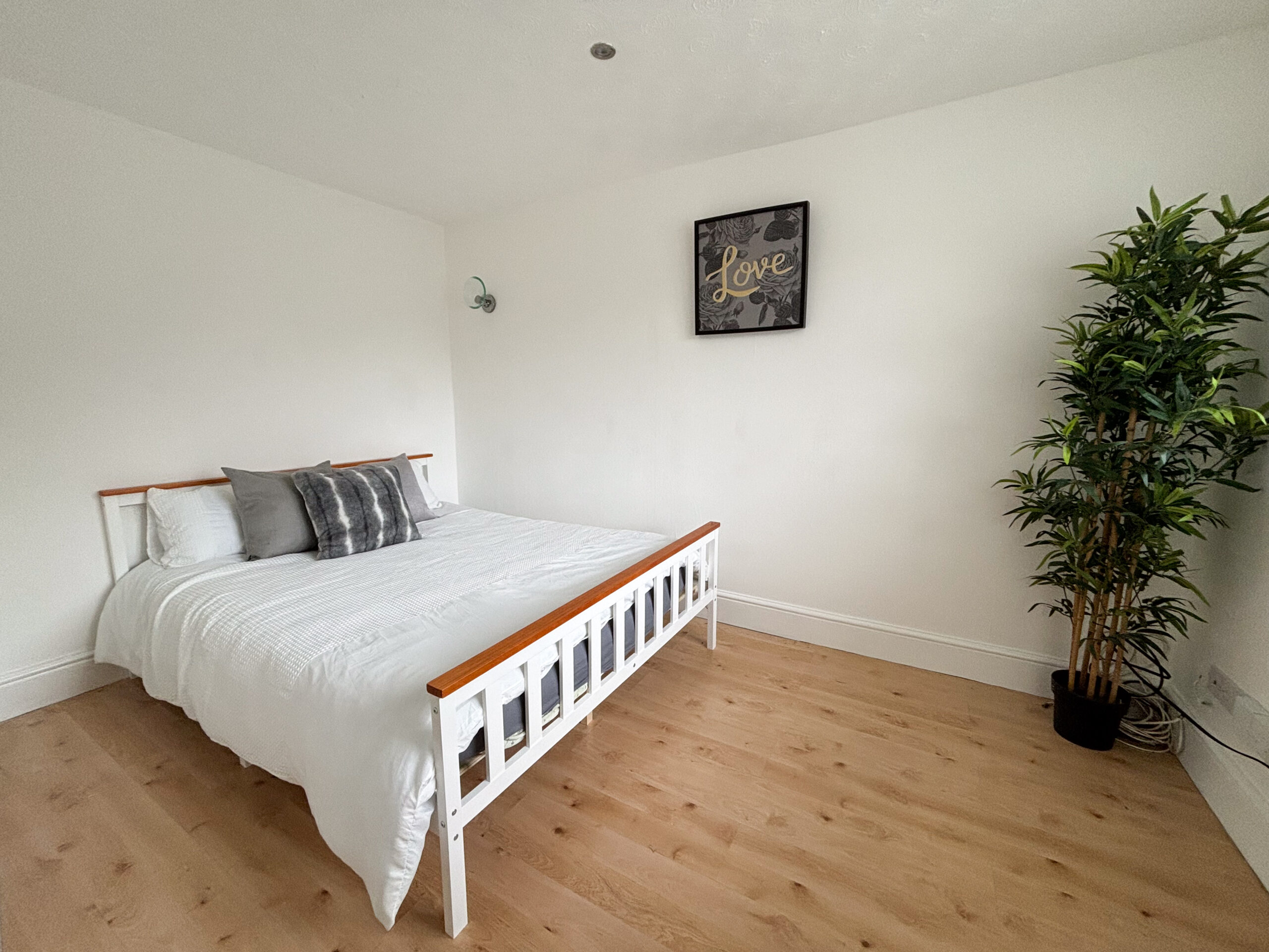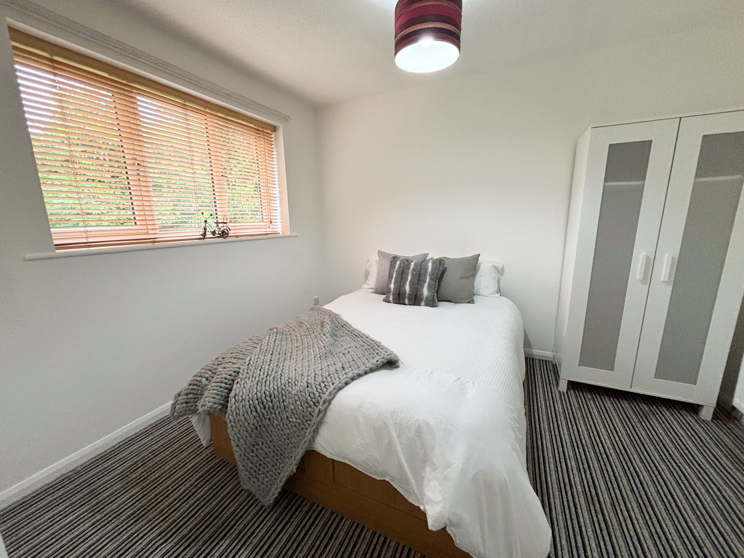A good sized, neutrally decorated, light and airy double room situated on the ground floor with a large window looking out over the back of the property. It contains a wardrobe, double bed, desk and chair, with laminate flooring.