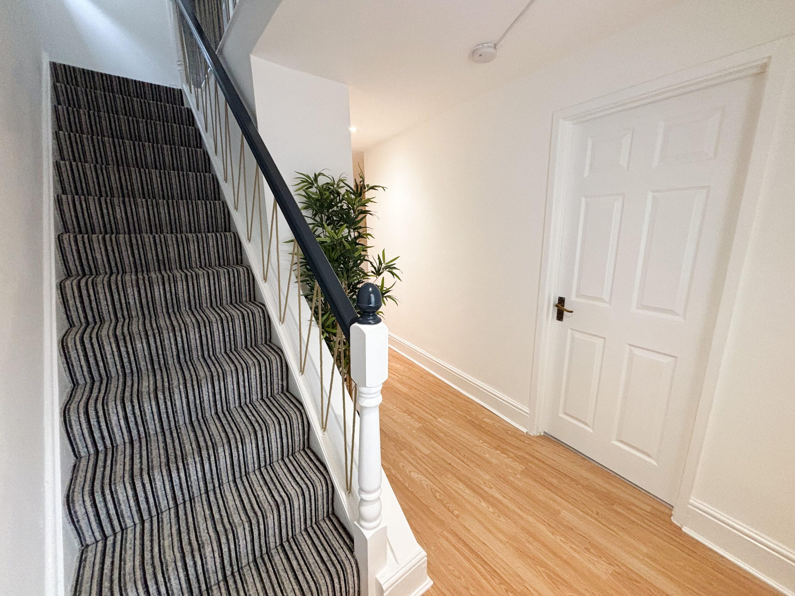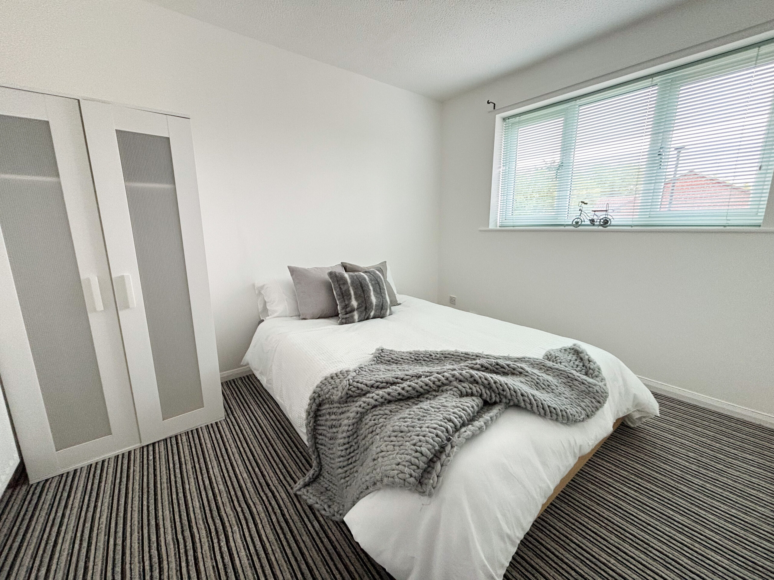 A good sized, neutrally decorated, light and airy double room situated on the first floor with a large window looking out over the back of the property. It contains a wardrobe, double bed with storage underneath, desk and chair, with newly fitted stripped carpets.