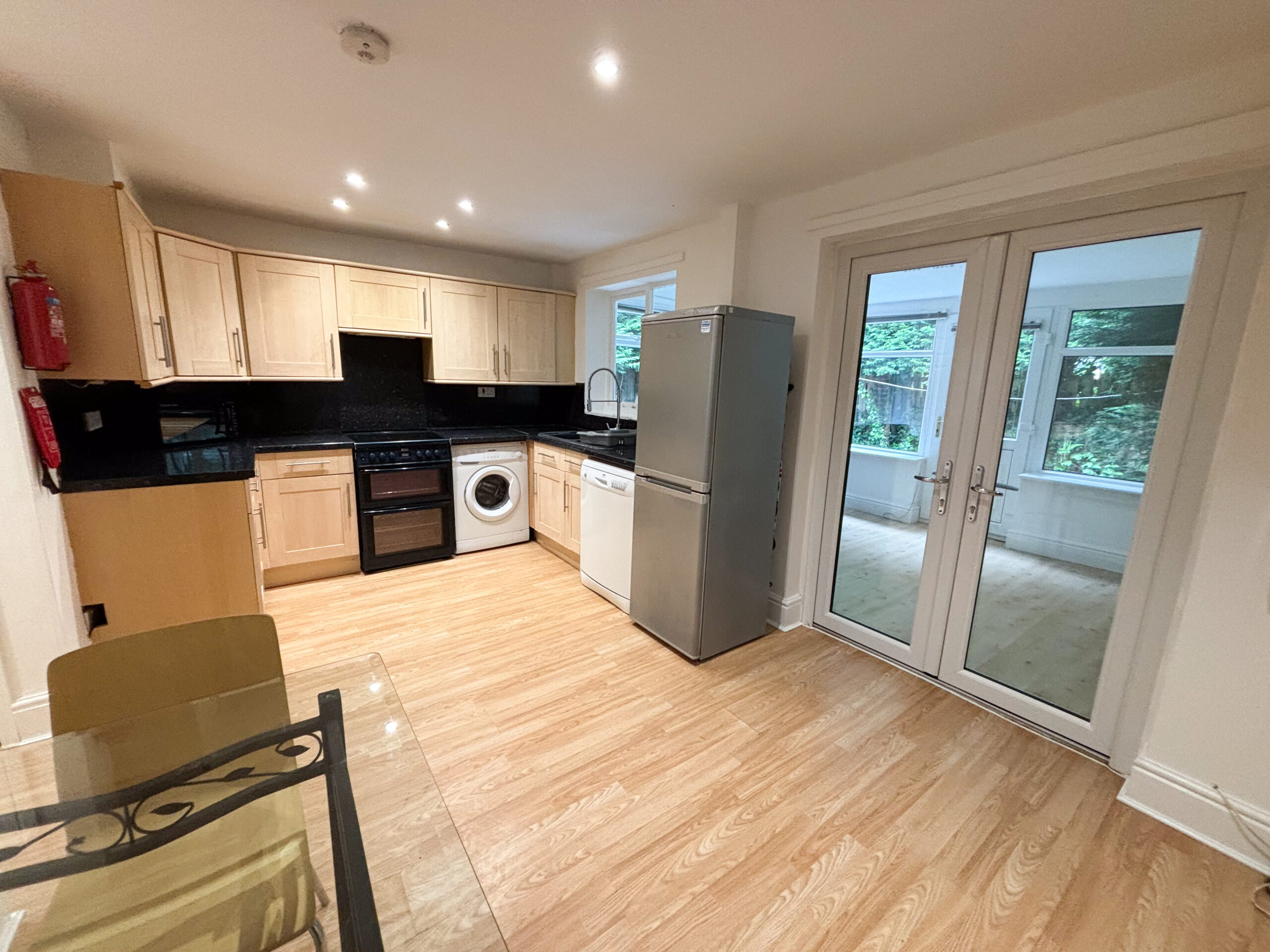 This large modern fitted beech kitchen with black speckle work tops, comes with an oven, and an overhead extractor, a washing machine, fridge freezer and dish washer. The kitchen has a large window above the sink overlooking the lounge area and laminate flooring throughout. There is also a dining area at the bottom of the kitchen which comes furnished with a modern glass table and four chairs, there are also french doors leading out into the lounge area.