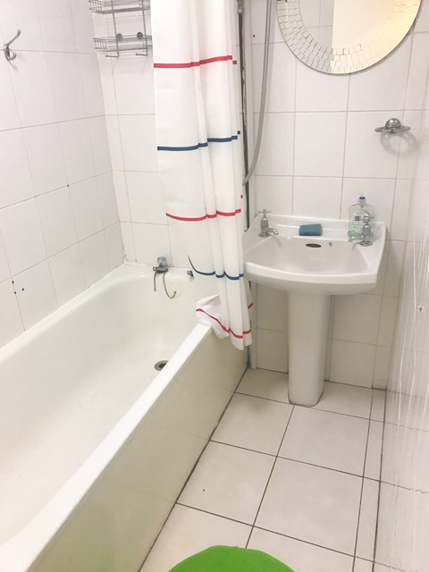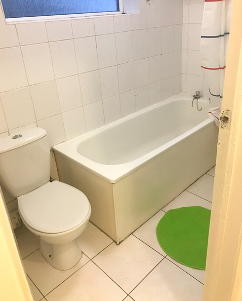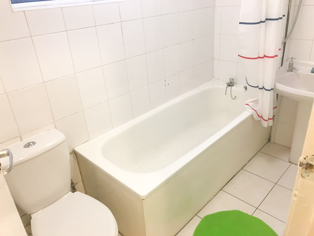 Leading off the kitchen, is the bathroom which contains fully tiled walls and floor and contains a bath with a shower over the bath, toilet and hand basin.