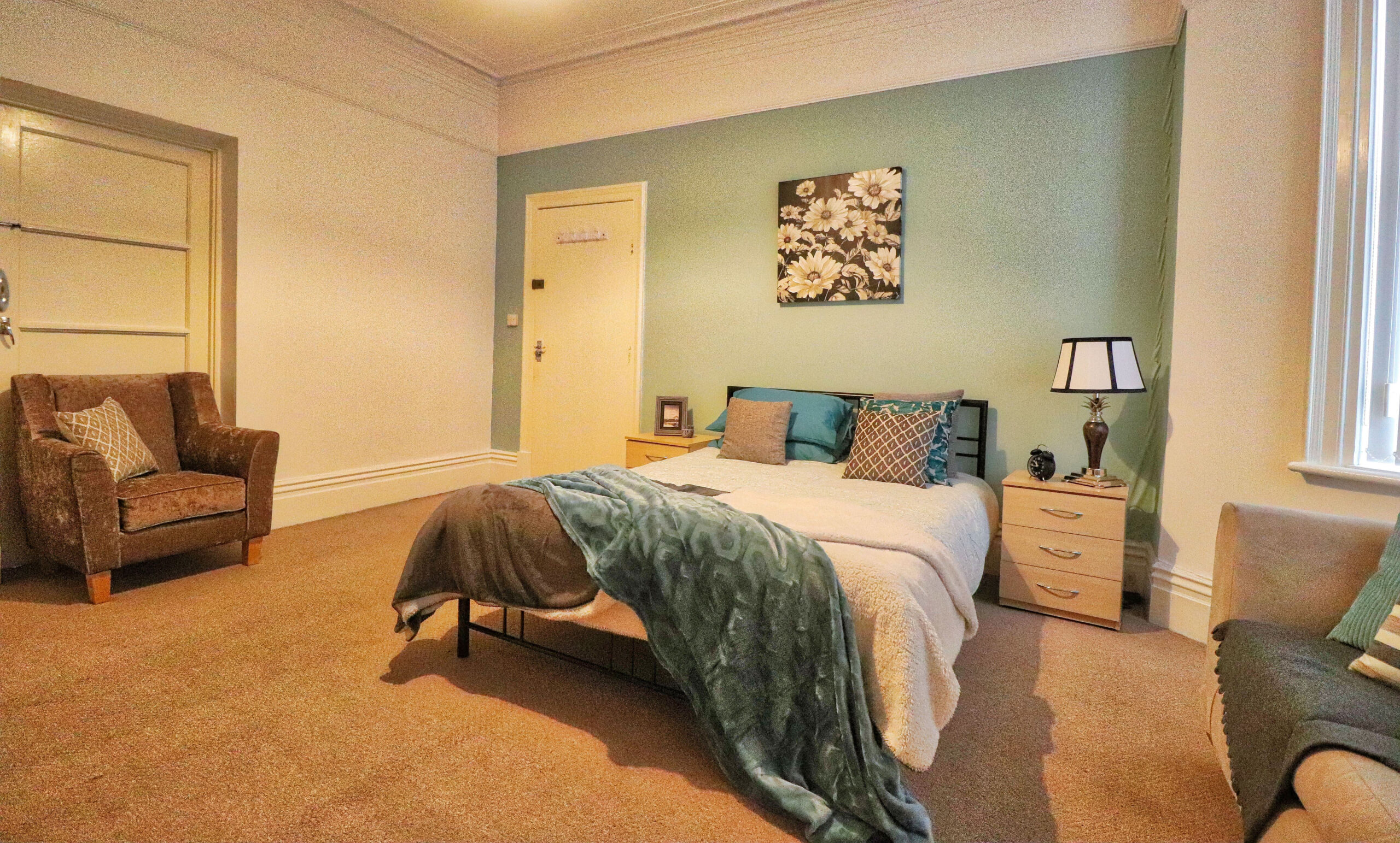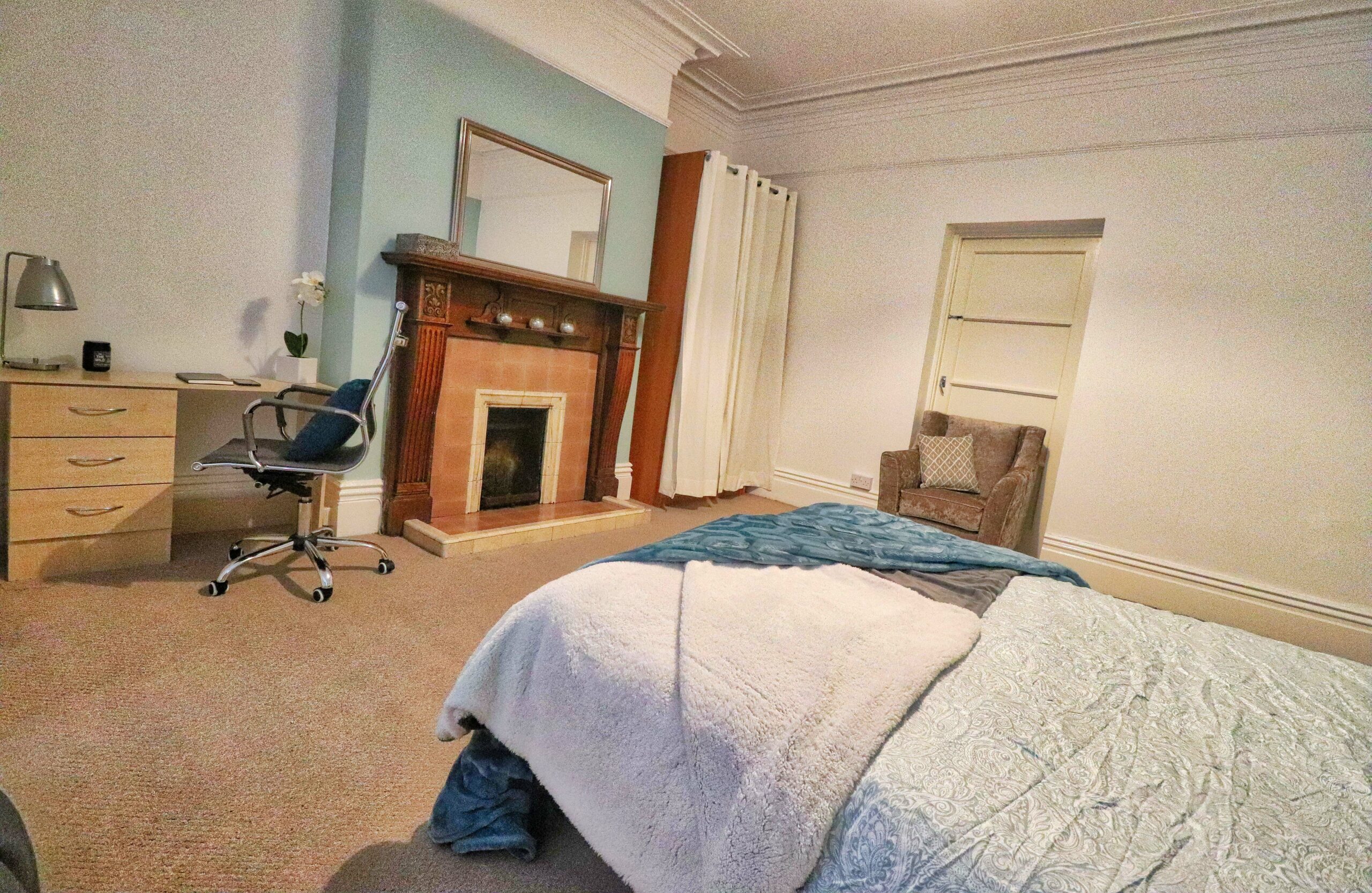 A very large, light and airy room situated on the ground floor with a large bay window looking out over the front of the property. It is suitable for either double or single occupancy and contains a desk, chair, wardrobe, chest of drawers, bed side table, double bed. The room also has a tv aerial point. The room contains the original Victorian fire surround.