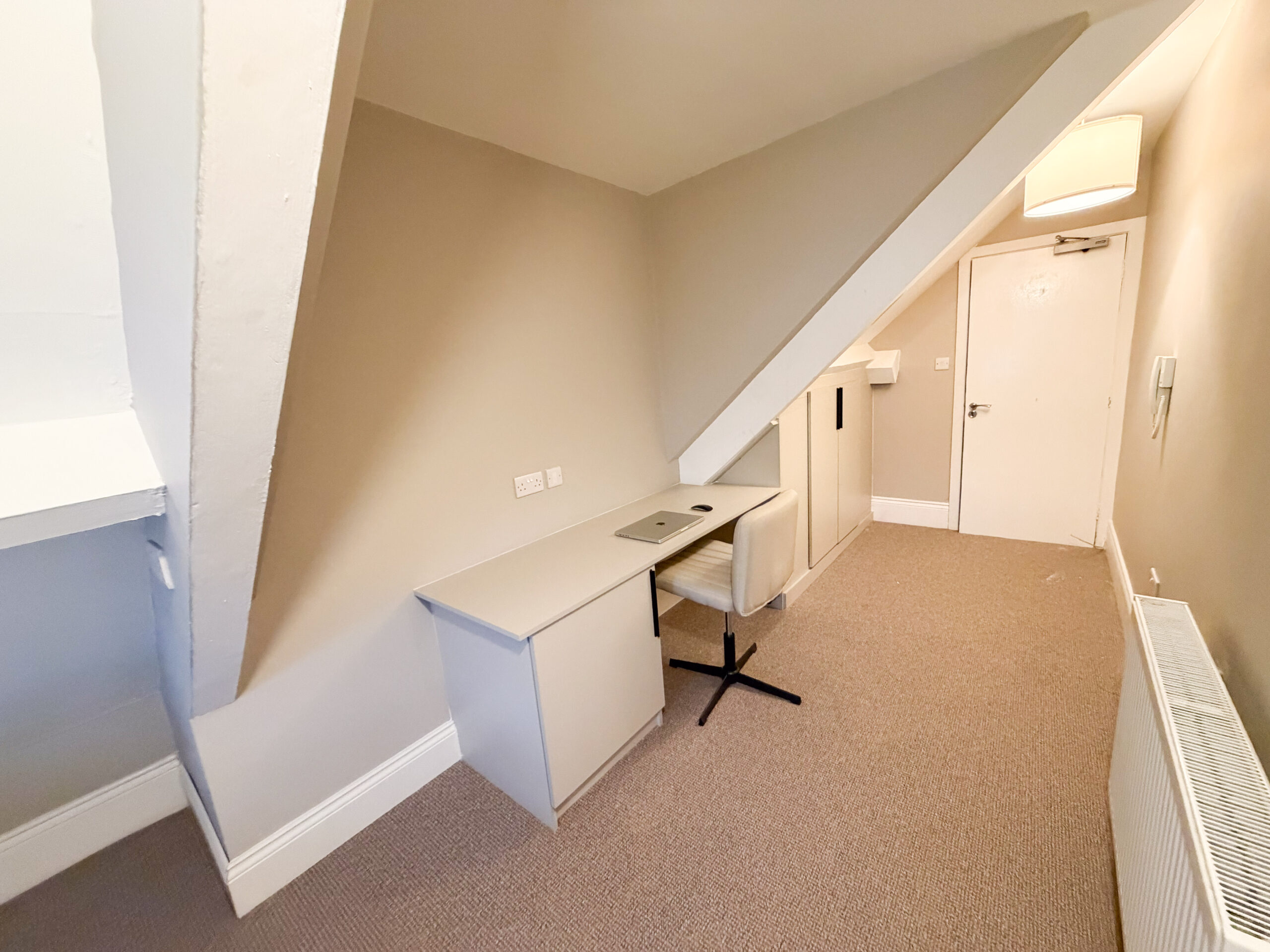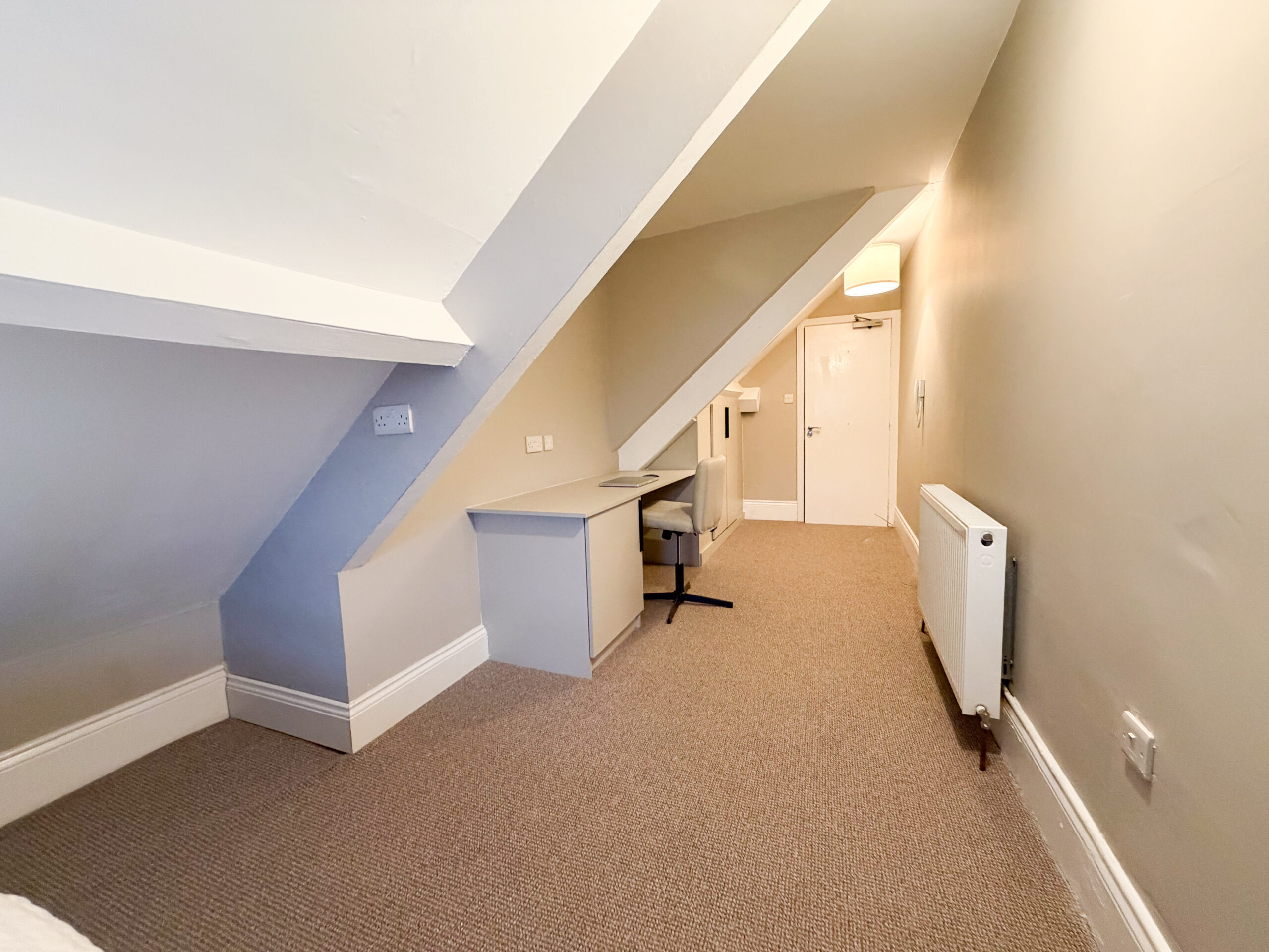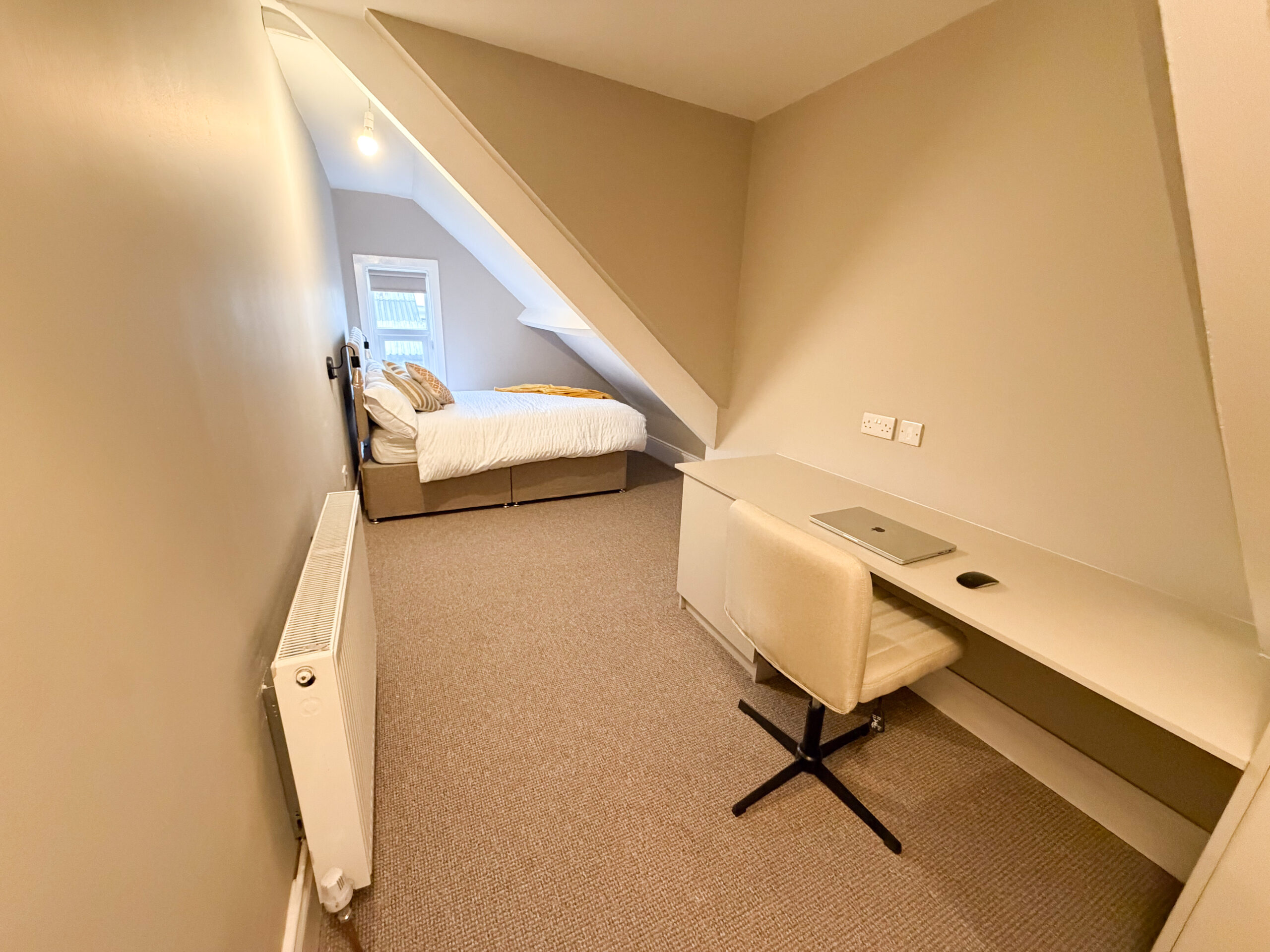 A generously sized room finished to a high specification, furnished with a bed and mattress, wardrobe, desk, and flat-screen TV. The bed features LED lighting behind the headboard. The room benefits from a private off-suite bathroomlocated on the second floor, comprising a shower, toilet, vanity unit, and mirror.