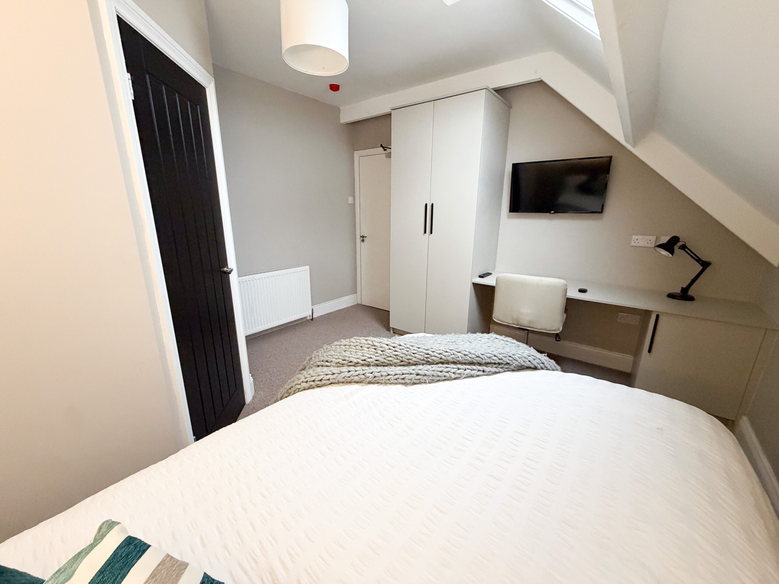 A double room on the second floor to the rear of the property. Fully furnished with a bed and mattress, wardrobe, desk, and flat-screen TV, with LED feature lighting behind the bed. The private ensuite bathroom includes a rainfall overhead shower, toilet, vanity unit, and illuminated mirror.