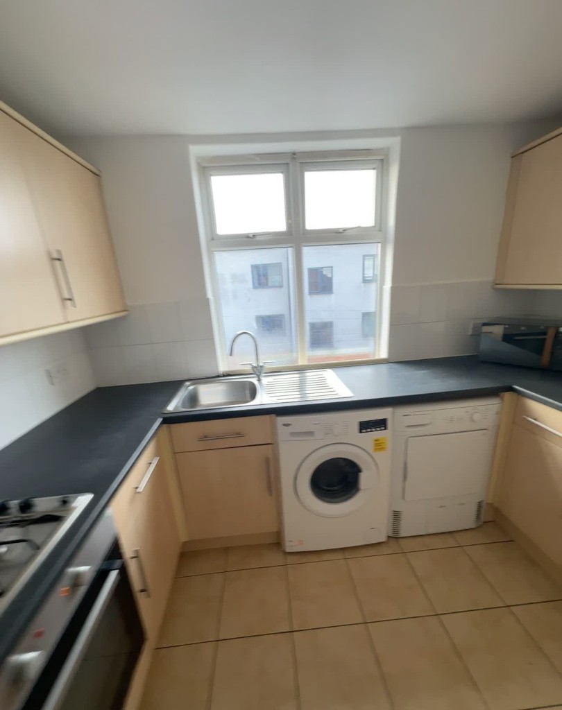 At the end of the corridor is a large kitchen with a back door leading to the fire access and it also contains a window which overlooks the side aspect of the property. The kitchen is a modern beech, fitted kitchen with tiled splashbacks. The kitchen is fitted with gas hob and extractor hood, electric oven, washing machine and a separate fridge freezer. The kitchen has a cream tiled floor and is neutrally decorated.
