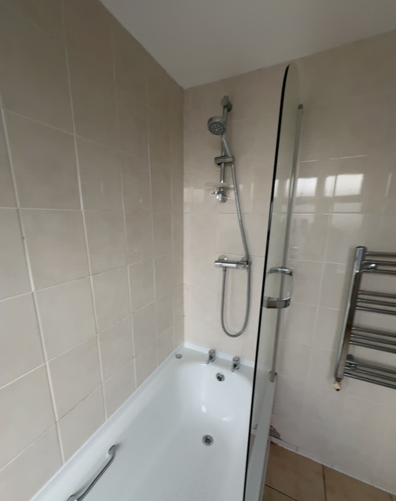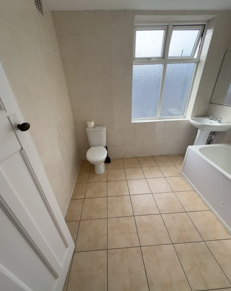 The hallway leads to a light and airy, fully tiled bathroom which comprises of a white wc, basin, bath and shower over the bath and bath screen and spotlights. The bathroom contains a large window, which overlooks the side of the property.