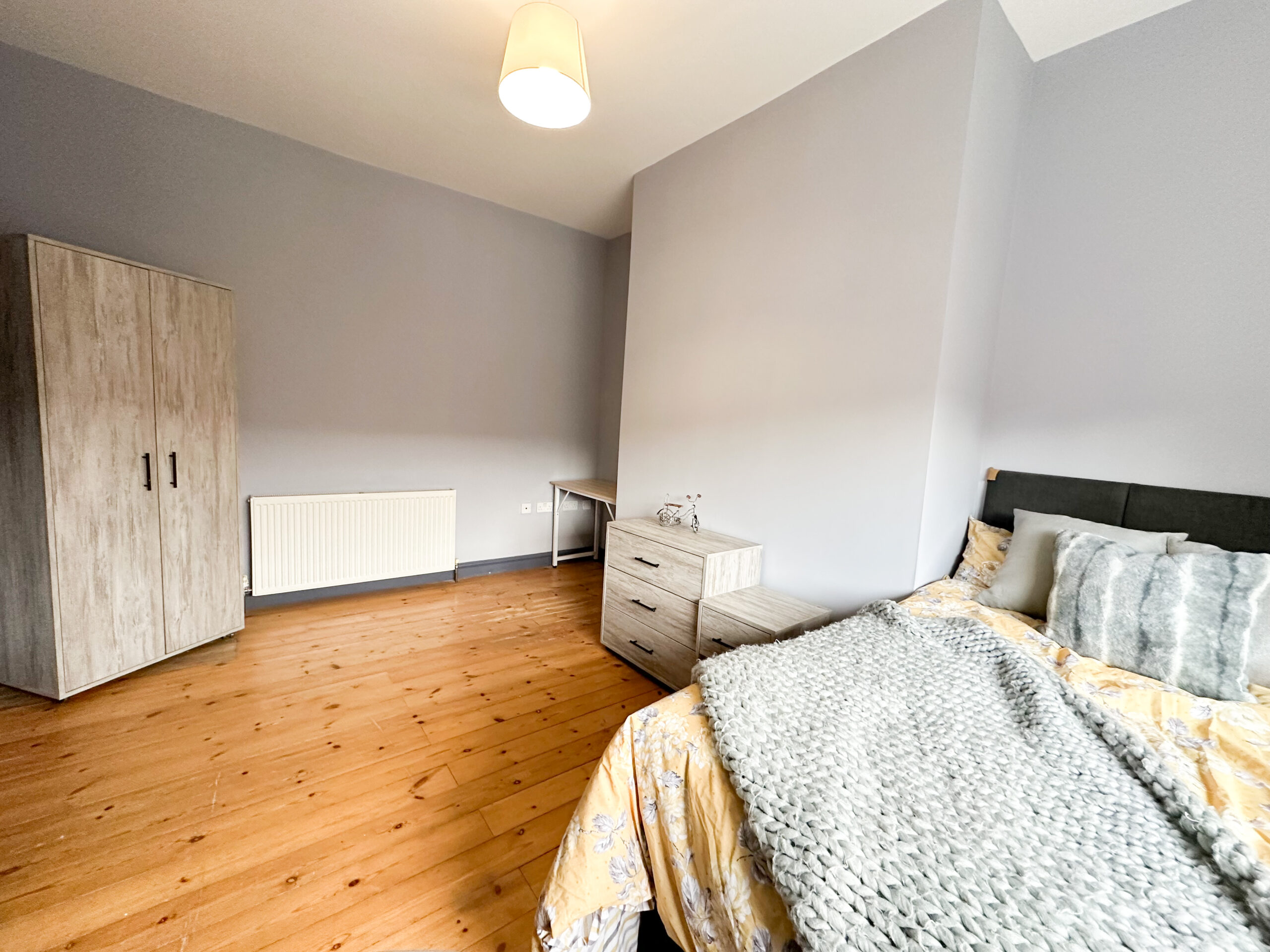 This is a large double en suite room, furnished with a double bed frame and mattress as well as a wooden wardrobe, desk and chair.