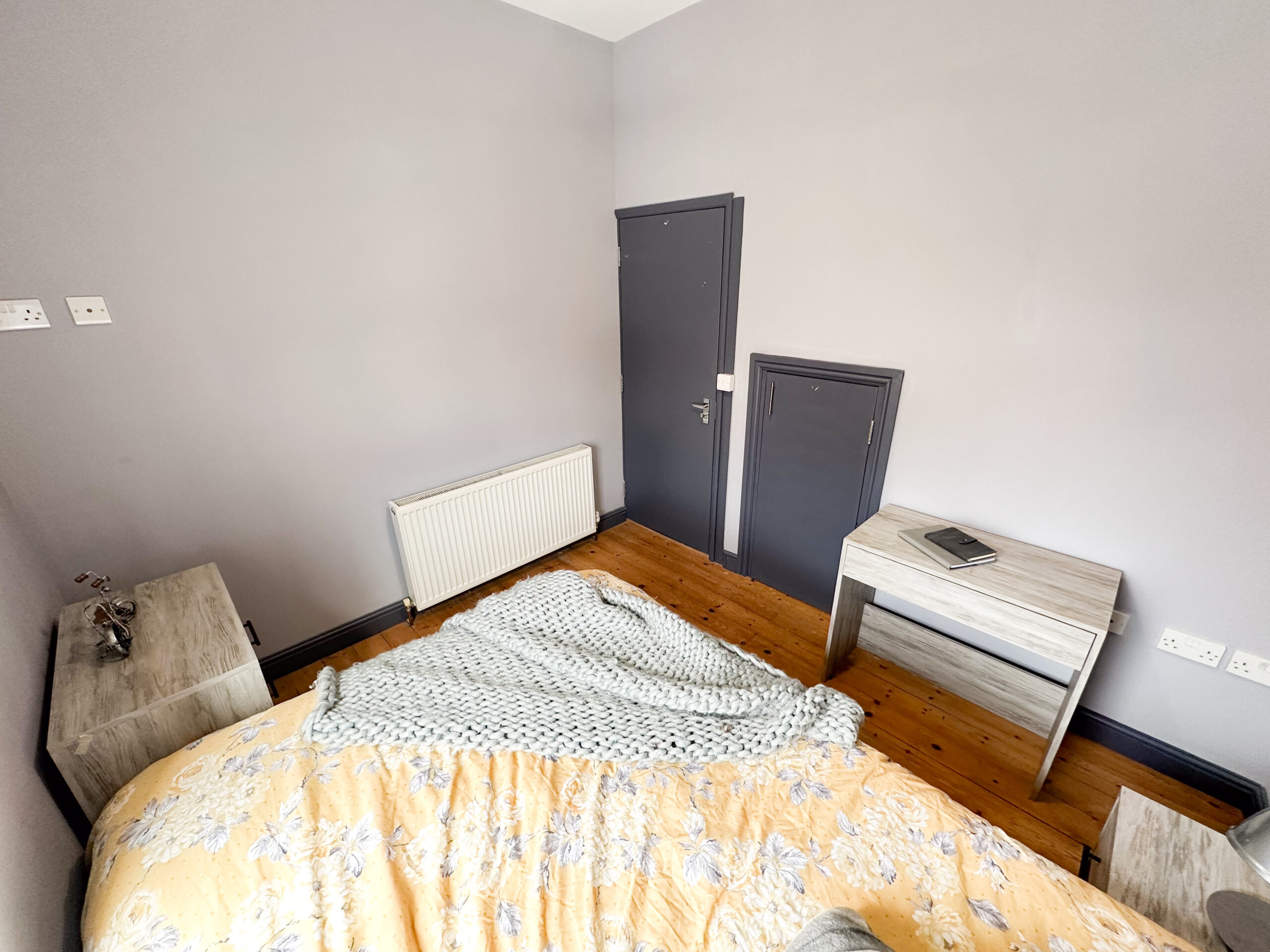 This is a double bedroom with a private shower room. The room has a desk, chair, wardrobe, bed and mattress.