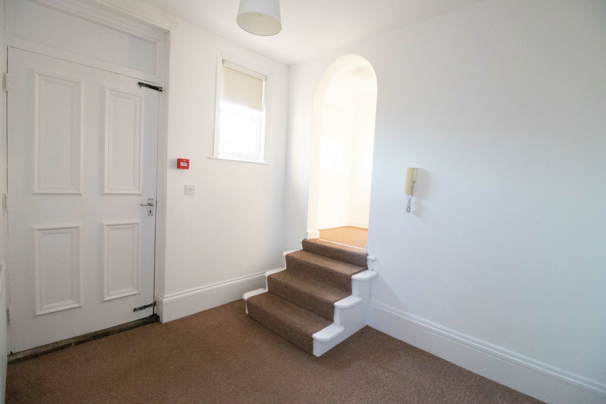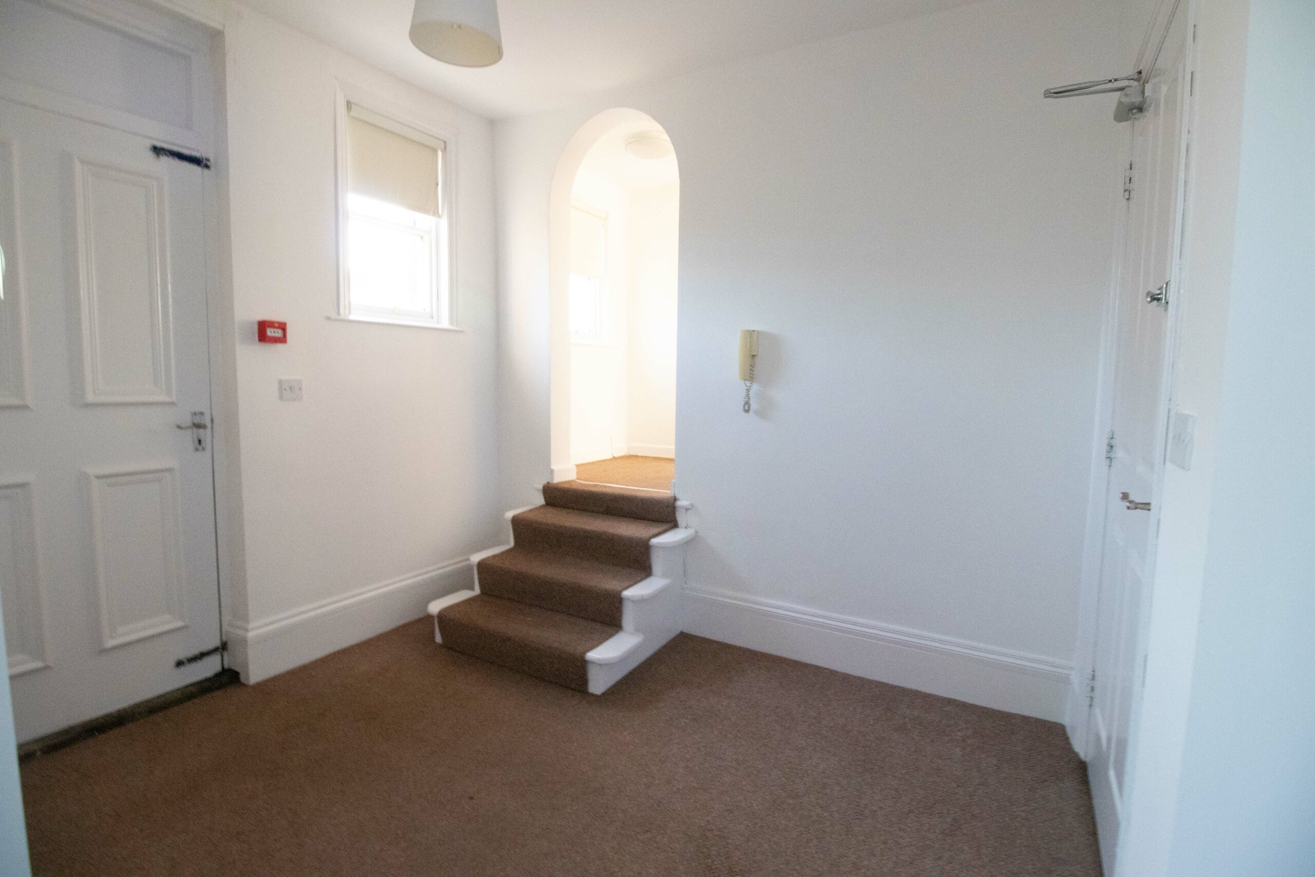 The properties small entrance hallway leads into an open plan lounge/kitchen with a large window overlooking the communal private carpark.