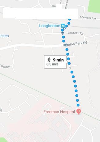 9 mins walk to Freeman Hospital (via Cosgrove Court — follow the path at the end of Cosgrove Court to the rear of the hospital)