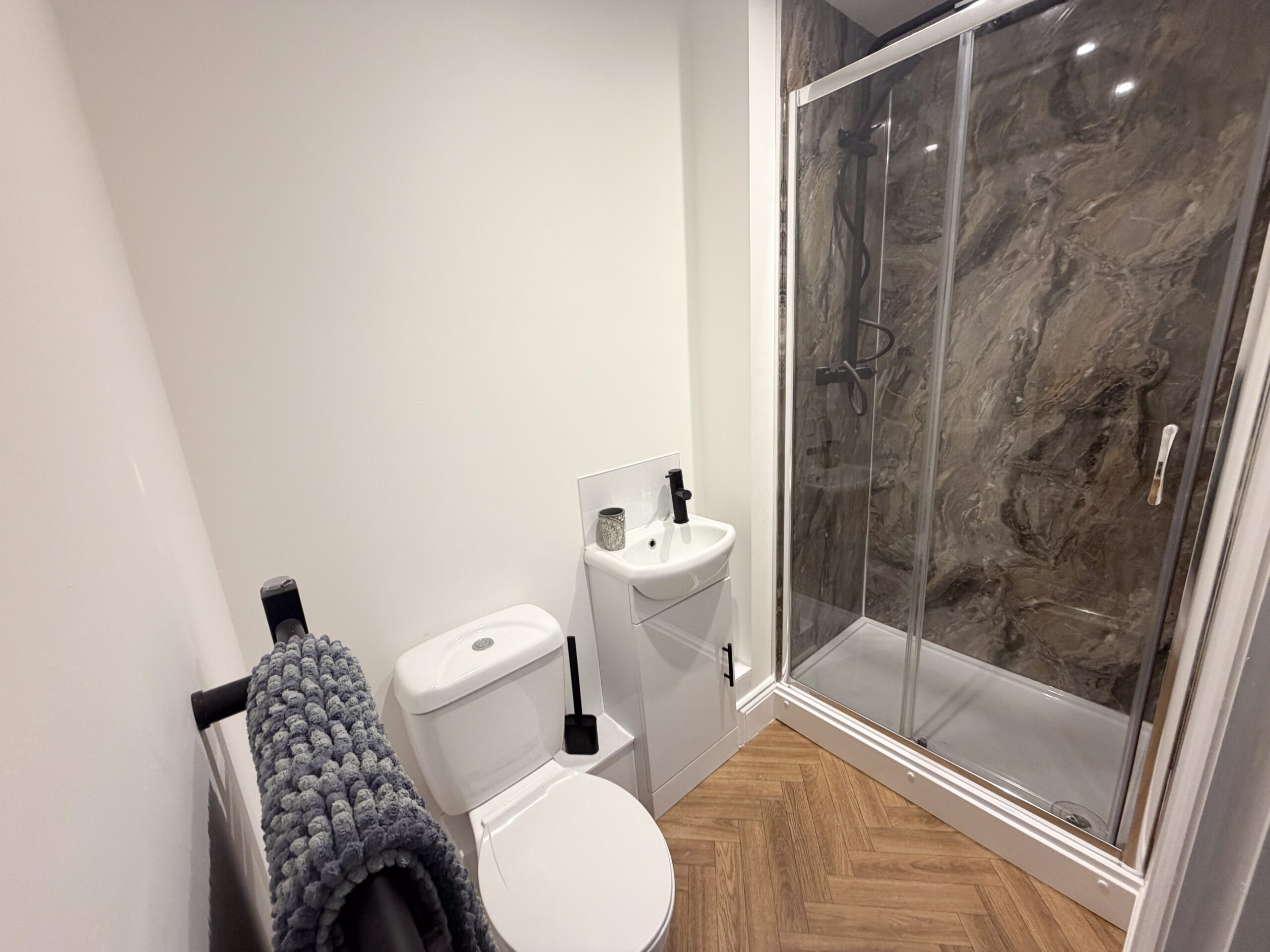 The property briefly comprises a white front door opening into an airy entrance hall leading to the first large double bedroom. The ground floor has a hallway leading through to a comfortable sitting room and a modern kitchen with electric hob and extractor hood, electric oven, American fridge freezer, dryer and washing machine. The kitchen includes a lounge area with a wall mounted flat screen TV, providing a sociable space for housemates. All rooms have either an en suite or a private bathroom with shower, toilet and hand basin.