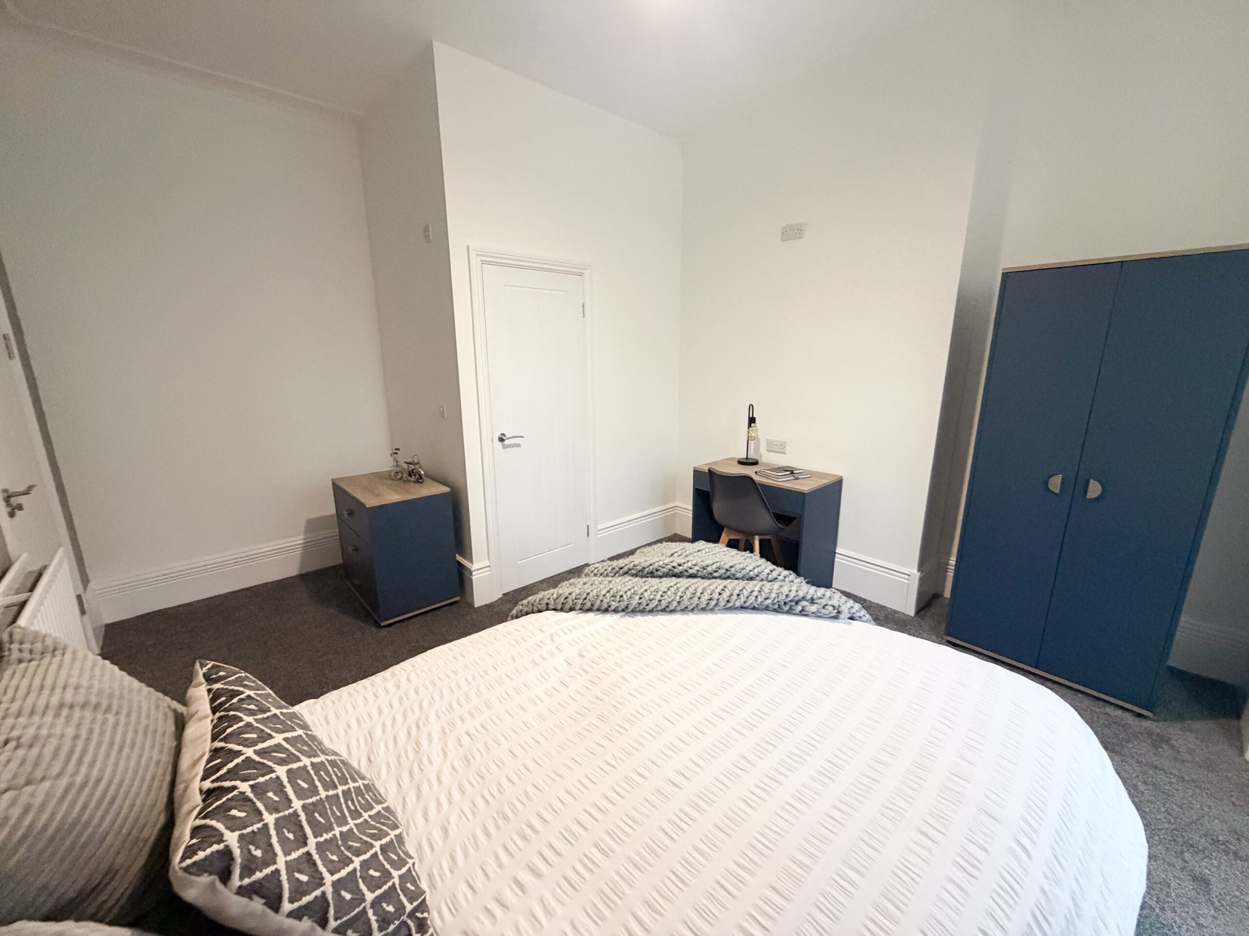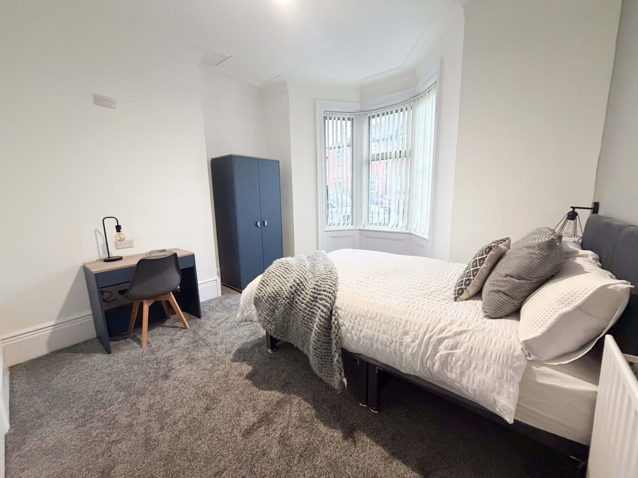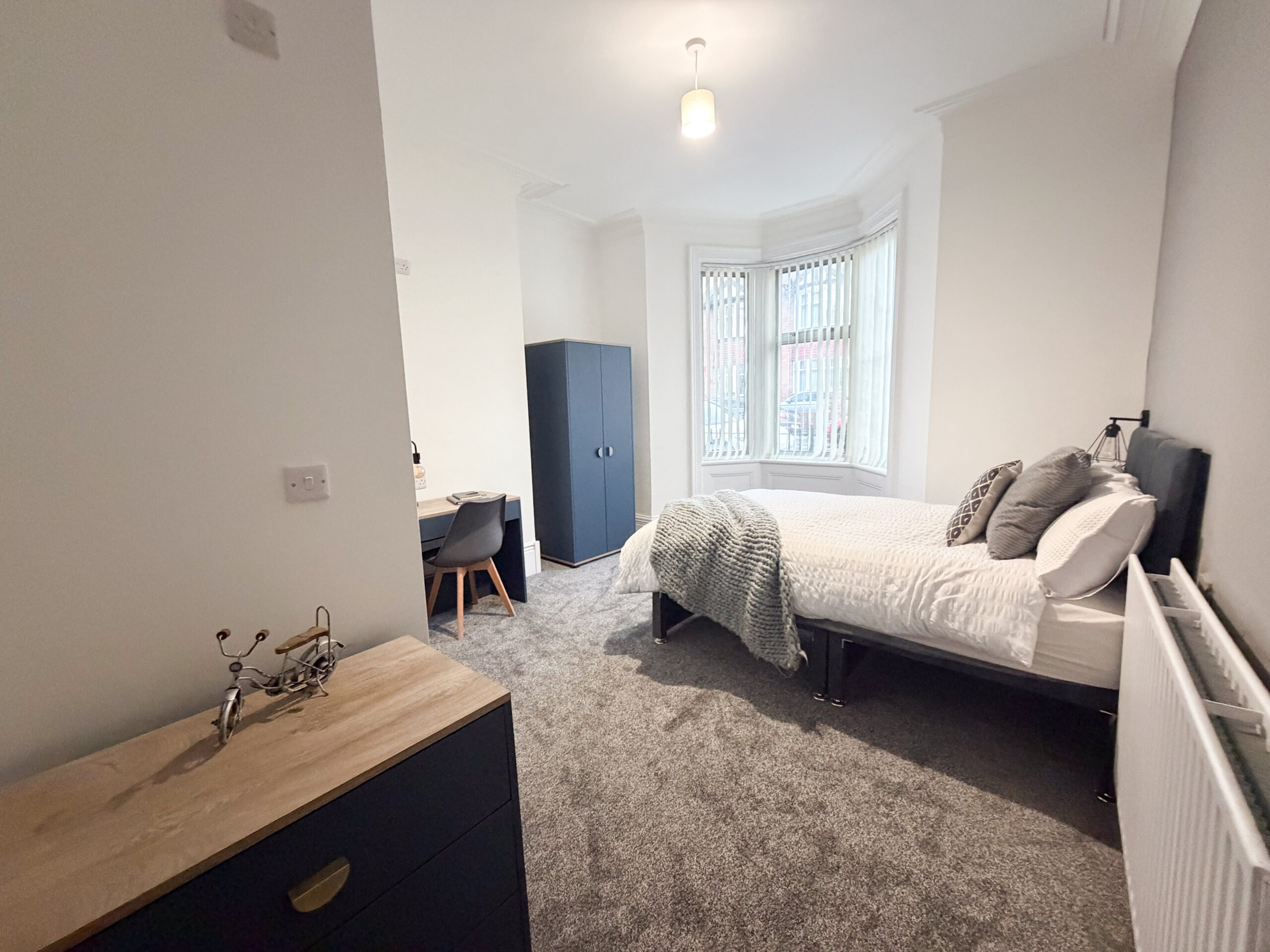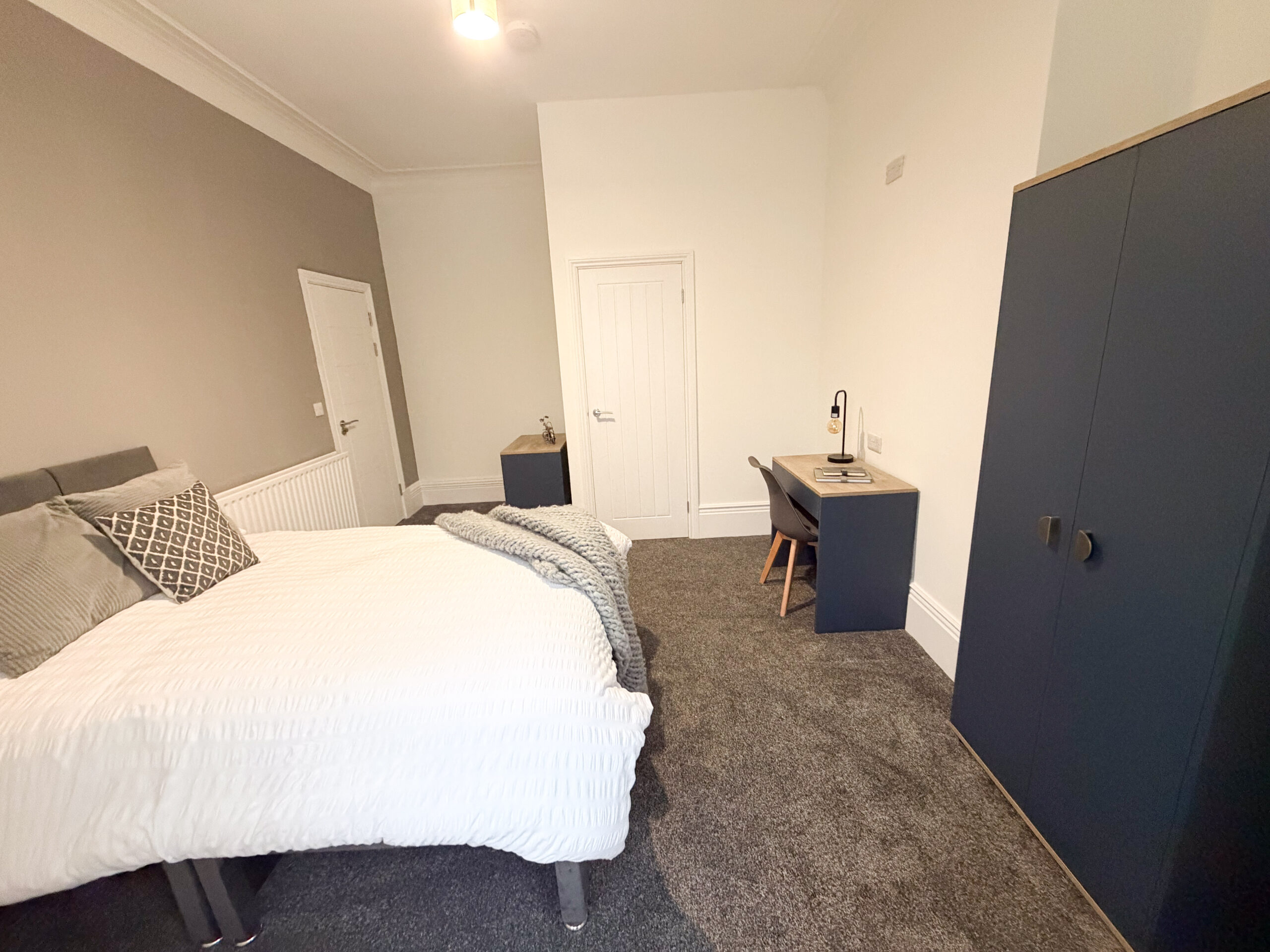 A fully furnished en suite double room on the ground floor with a double bed, bedside table, wardrobe and desk. Large windows to the front of the property provide a pleasant outlook over the quiet residential street.
