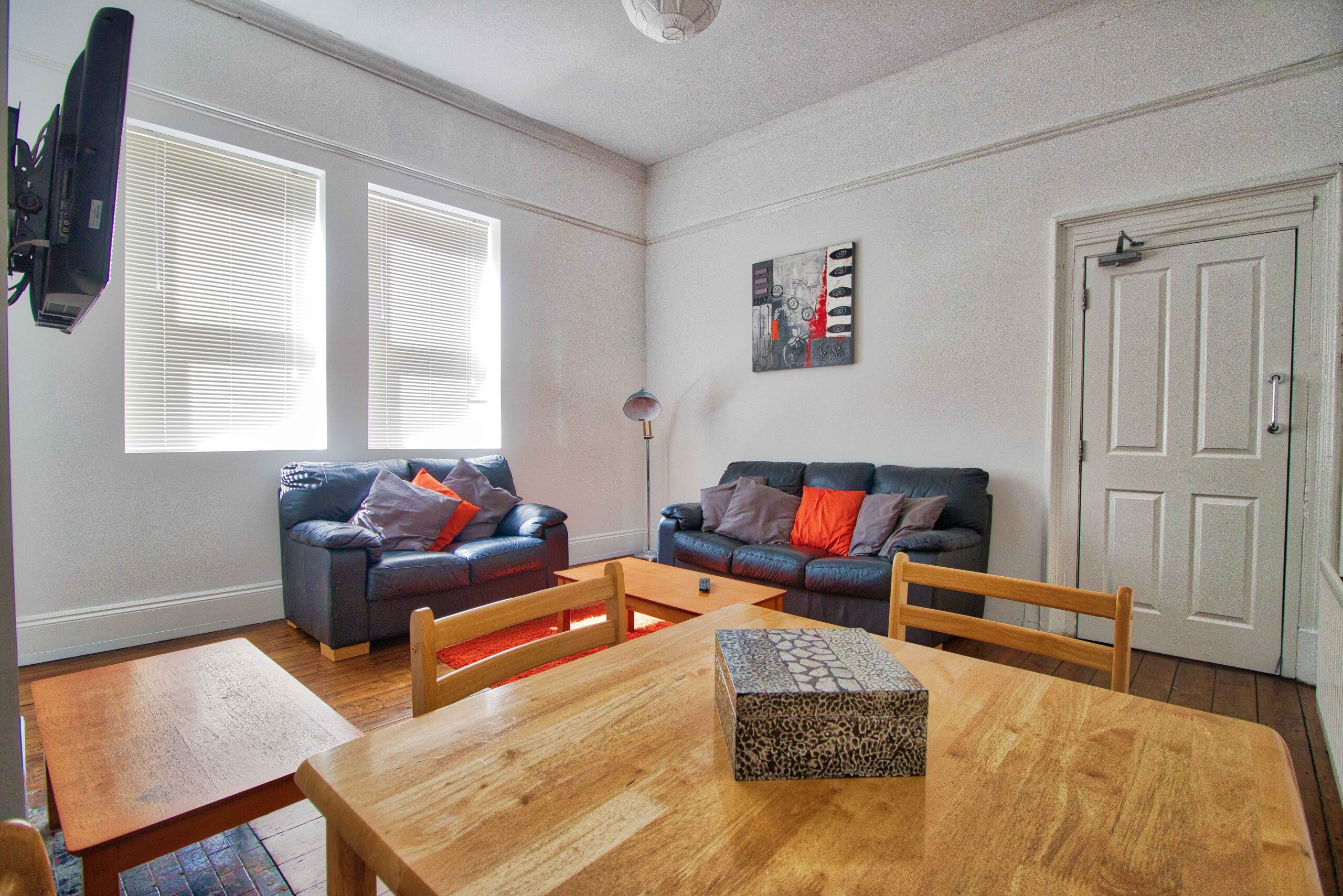 A very large communal sitting room with a large window to the rear of the property leading off the main entrance hall and containing three sofas, coffee tables, a tv and Virgin media box. This room also contains a dining table and chairs.