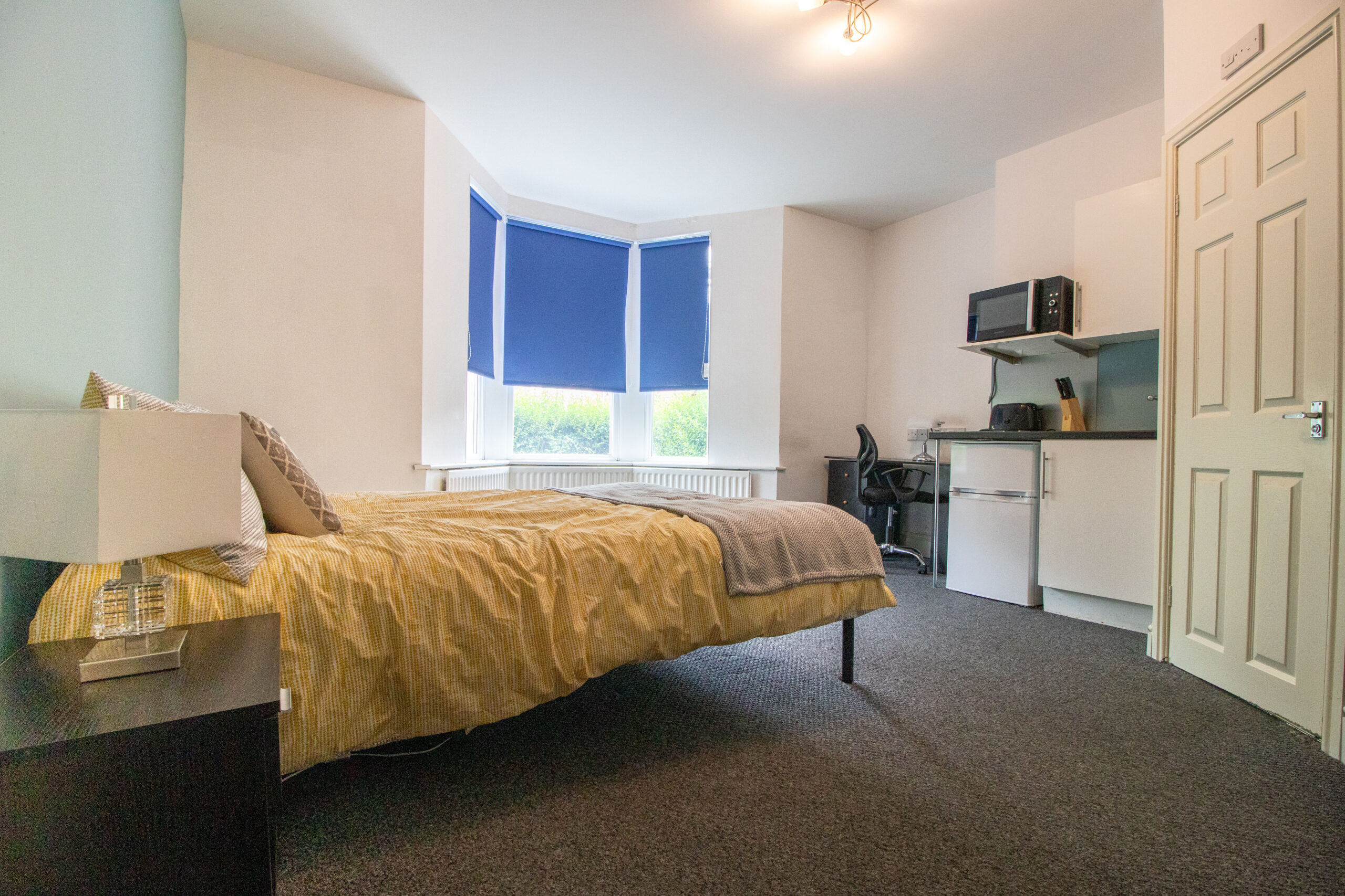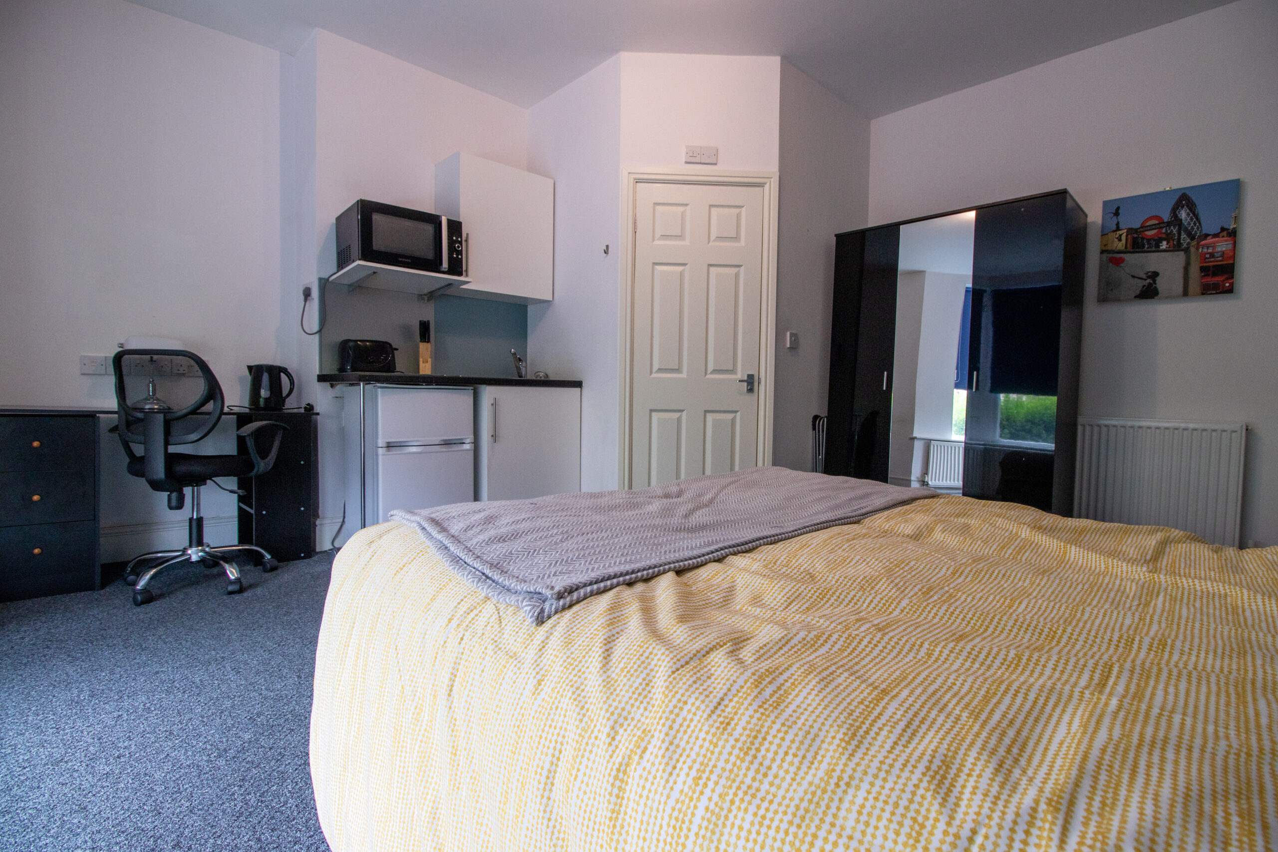 This is a bright and spacious, large double room on the ground floor with a bay window to the front of the property. The room is furnished with a double bed, bedside table, large wardrobe, chest of drawers, desk with chair. The room is newly carpeted and comes with a fully equipped kitchenette and also contains an en-suite shower room with an enclosed shower cubicle, toilet and hand basin and a stainless steel towel radiator.