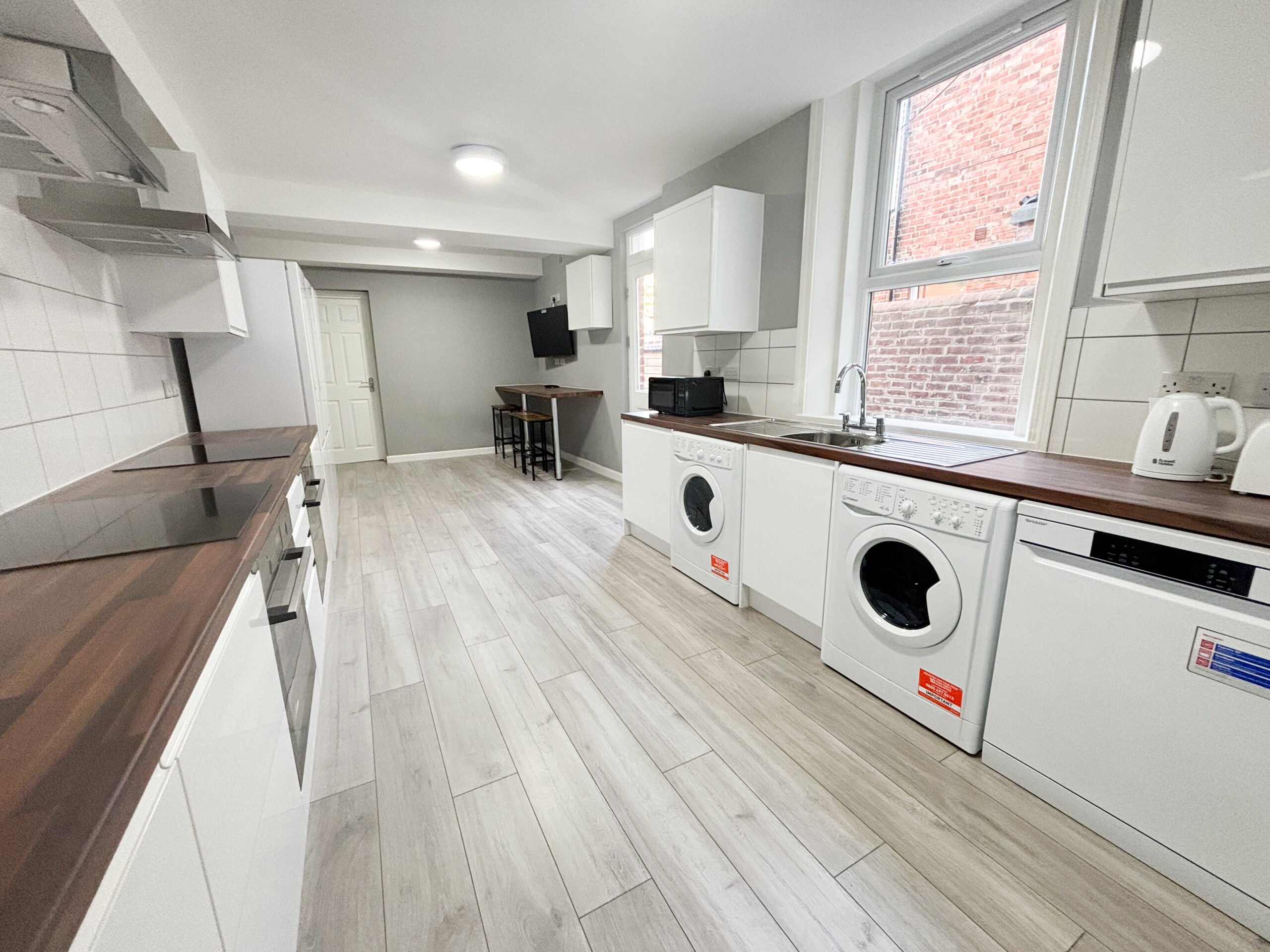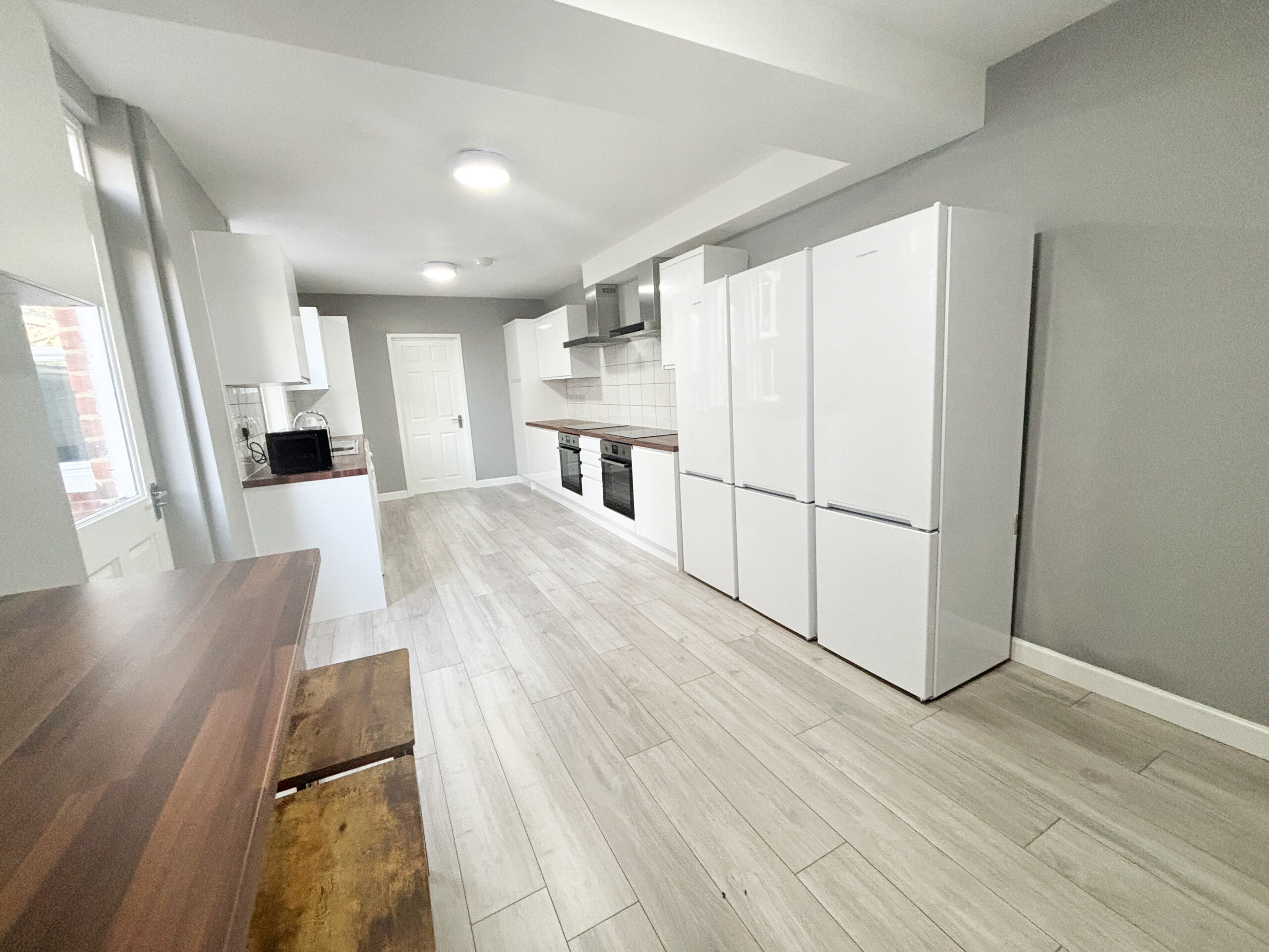 The ground floor comprises of a large entrance hall with a modern feel. It leads to the first bedroom, second bedroom and also the very large kitchen. The kitchen has been designed thoughtfully with two induction hobs and extractor hoods, two electric ovens, three fridge/freezers and a dishwasher. The kitchen also comes fully equipped with microwave, kettle, toaster, pots, pans and utensils. There is laminate flooring throughout the ground floor hallways and kitchen.