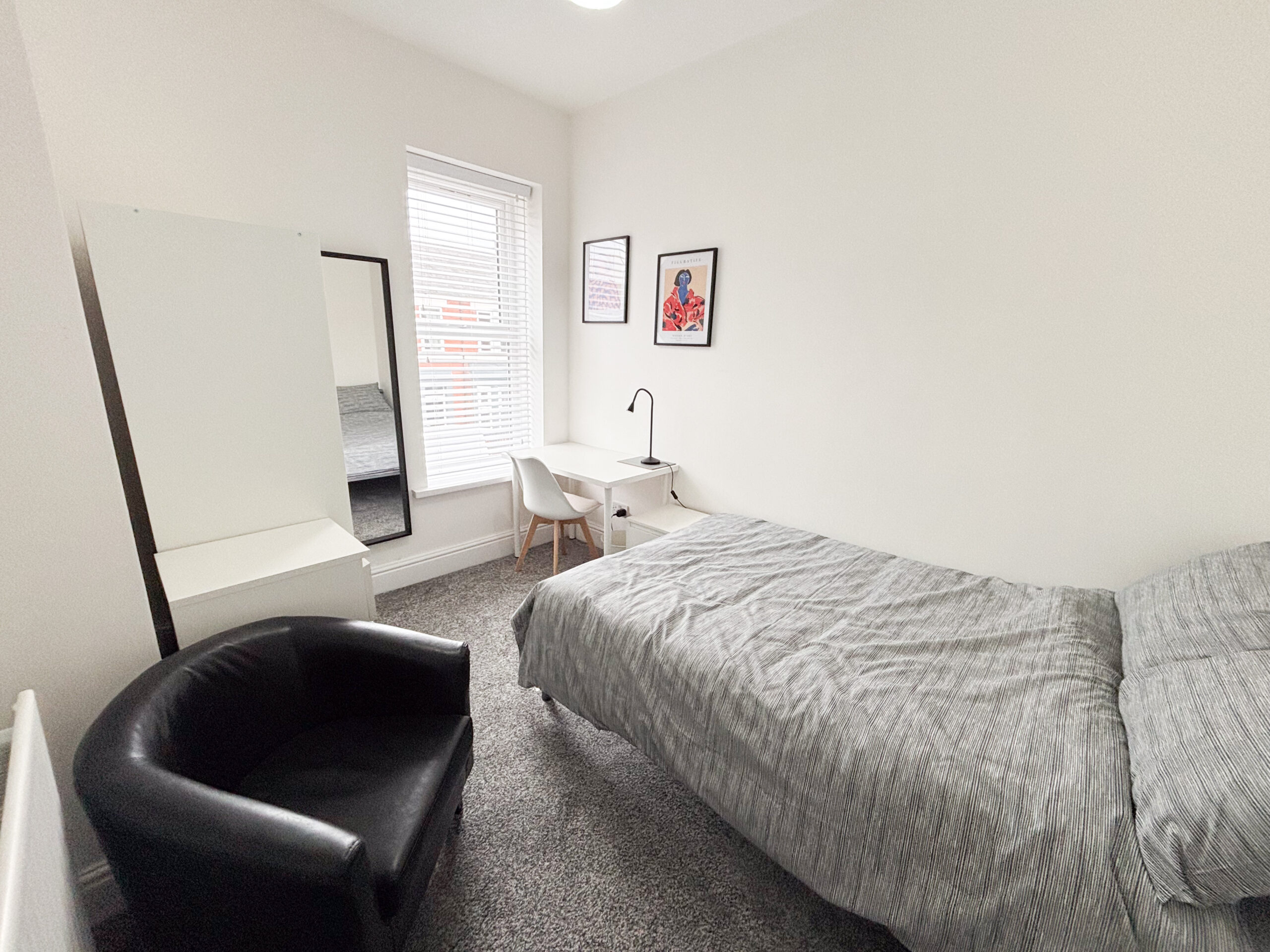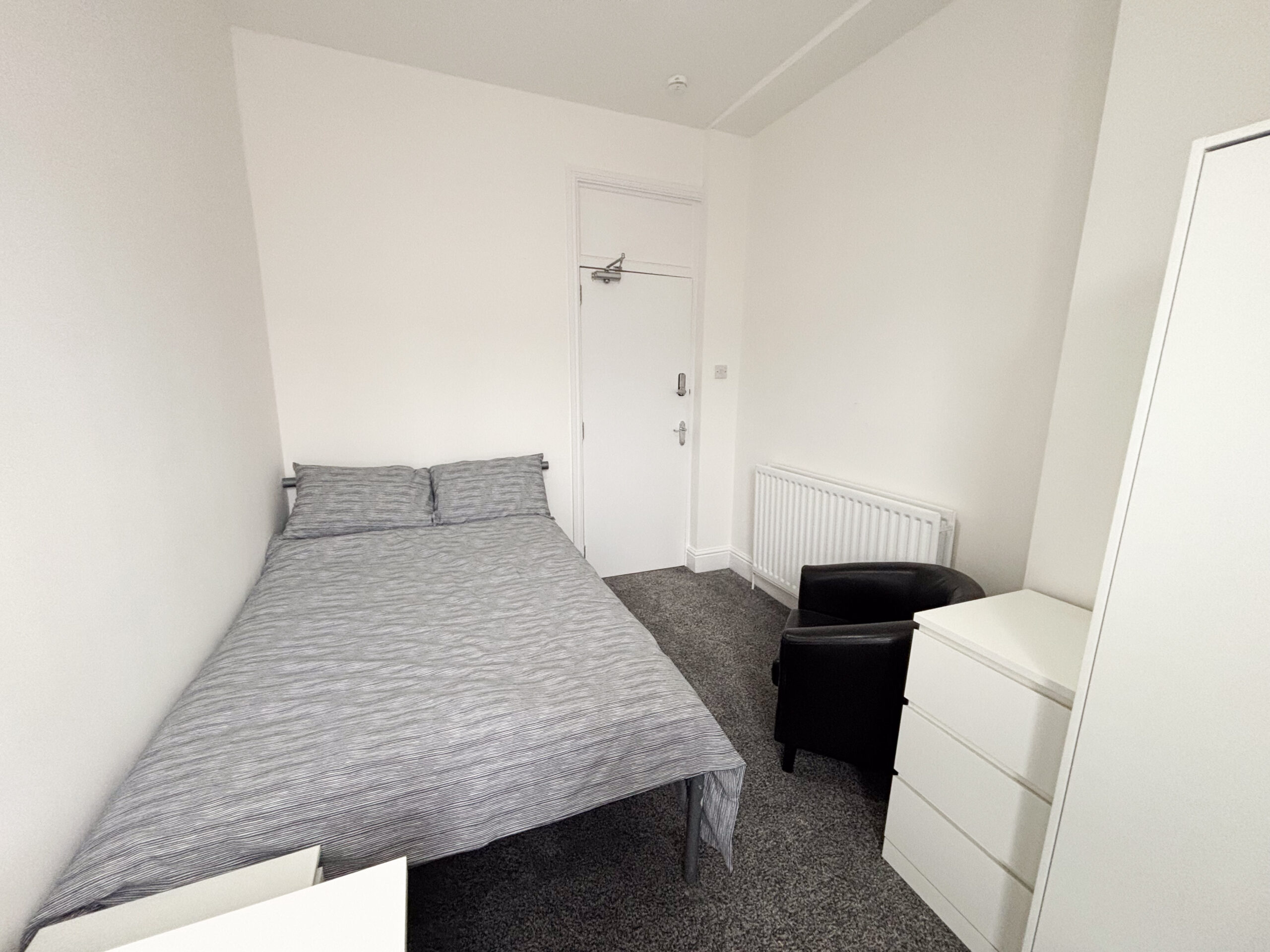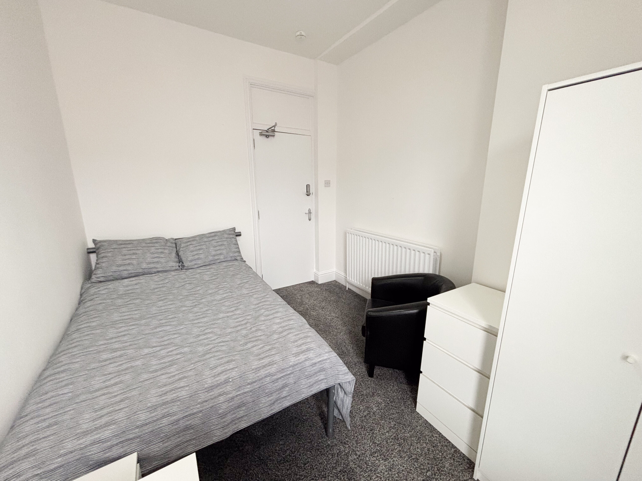 A double room located at the front of the house on the first floor. The room is bright and well proportioned, benefiting from natural light and modern neutral décor throughout. It comes fully furnished with a double bed, wardrobe, chest of drawers and desk, providing a comfortable and practical living space.