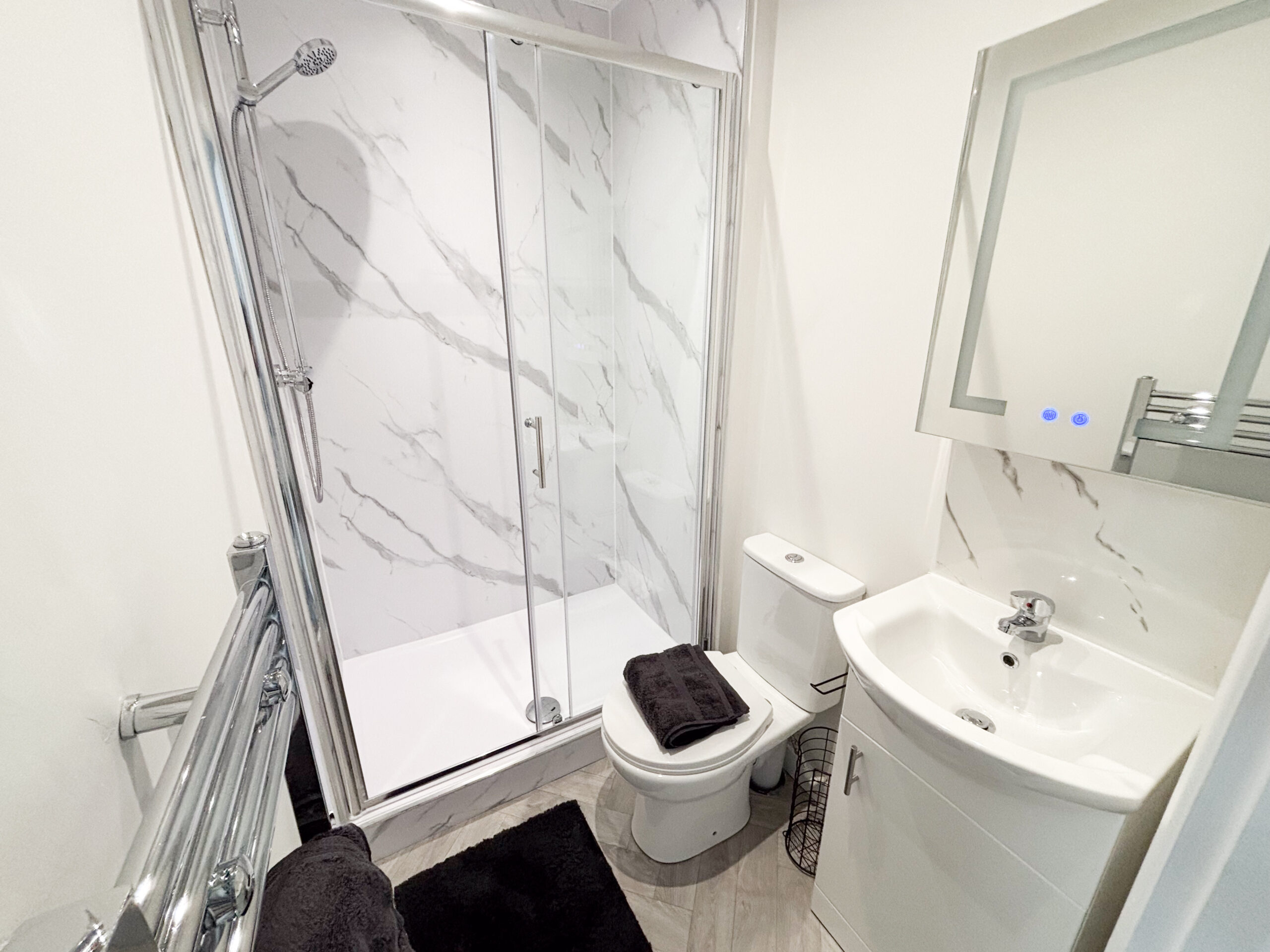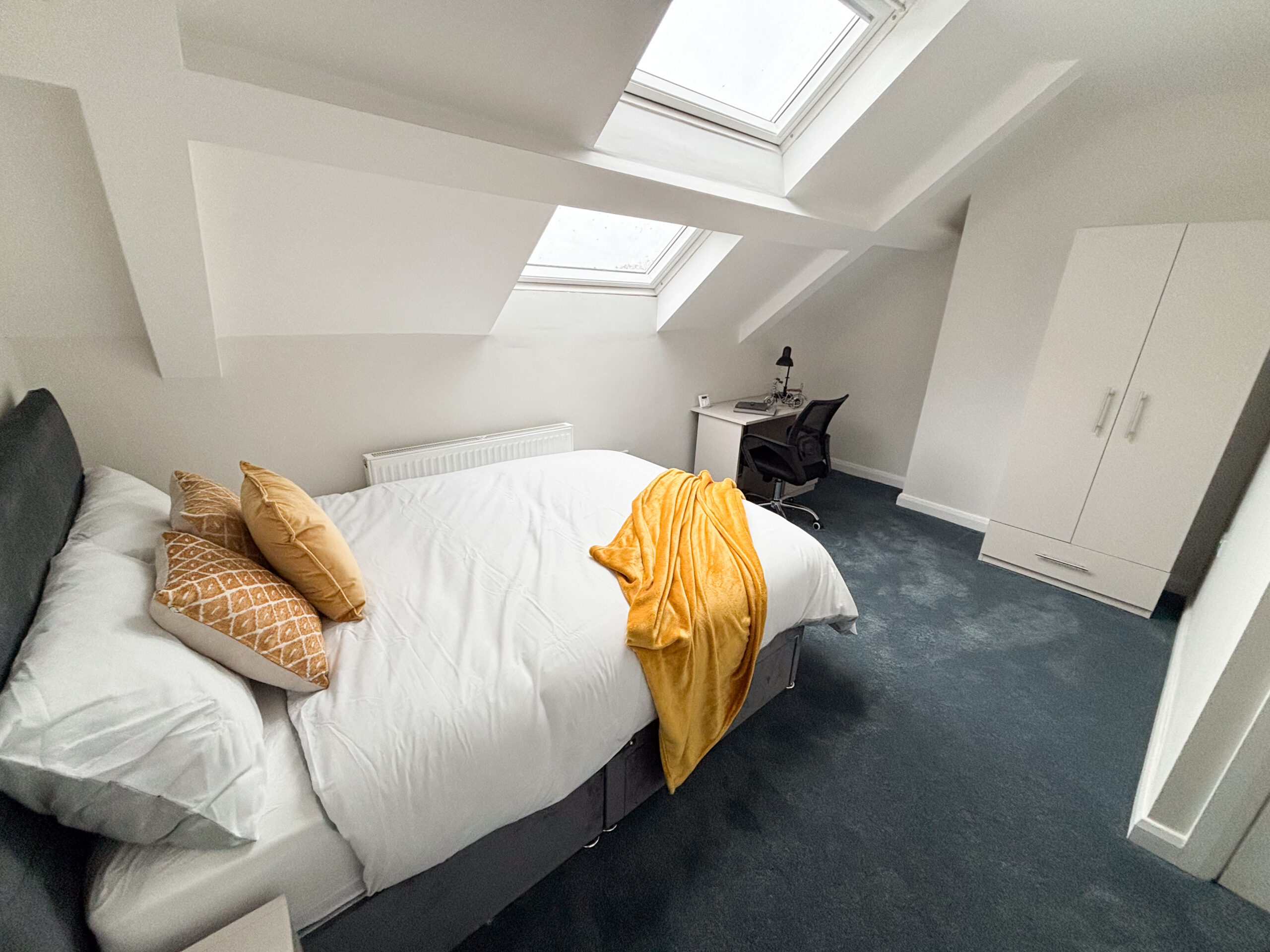 Across the upper floors, the property comprises seven generously sized bedrooms, all finished to a high standard and fully furnished with modern furniture including beds, wardrobes, desks, and seating areas where applicable. Each room benefits from its own private bathroom, with contemporary fittings, stylish tiling, and high-quality sanitary ware. A separate additional bathroom is also provided for guest use.