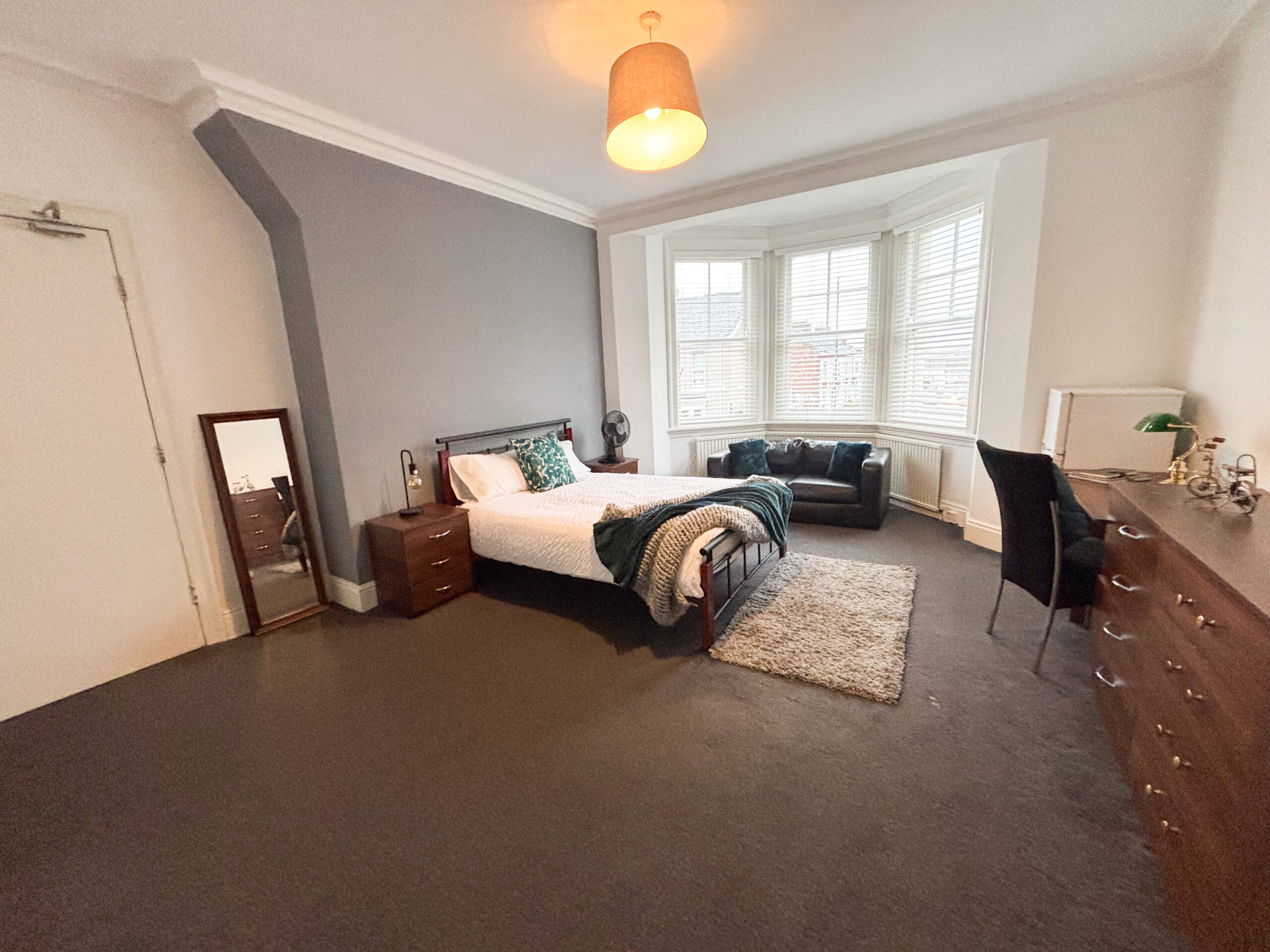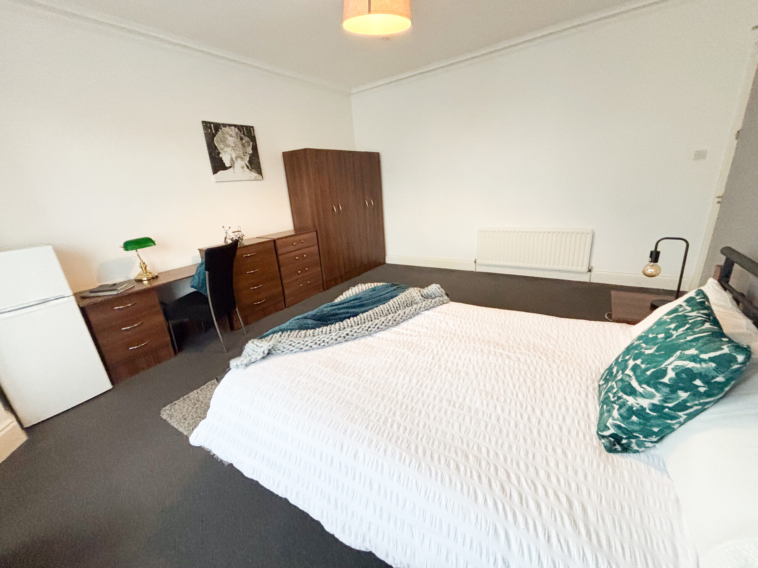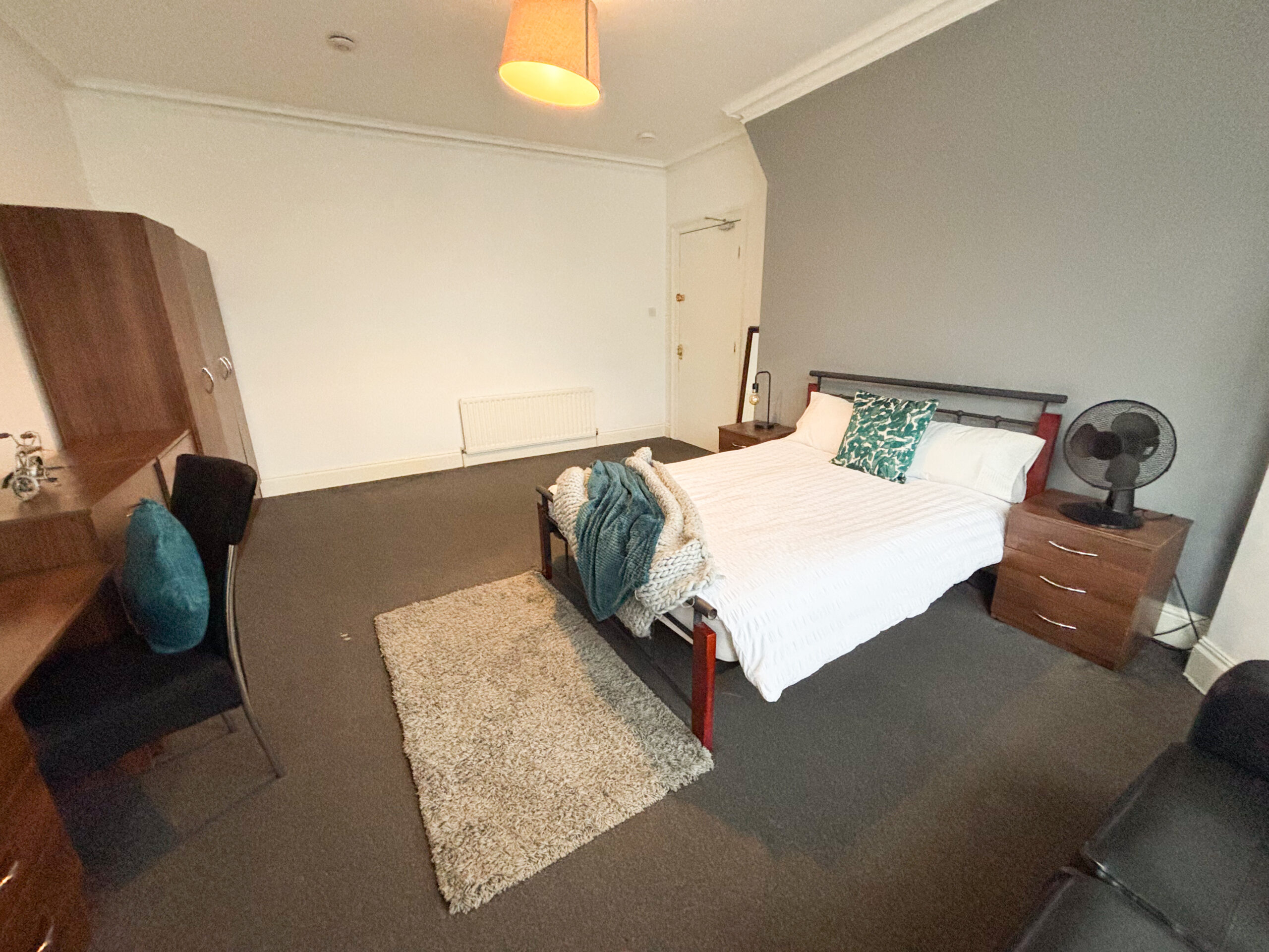 This is a large double room, with a window to the front aspect of the property. It is situated on the 1st floor at the front of the property. It contains a wardrobe, desk, chair, double bed, chest of drawers and bed side table and has a tv aerial point and is suitable for either double or single occupancy.