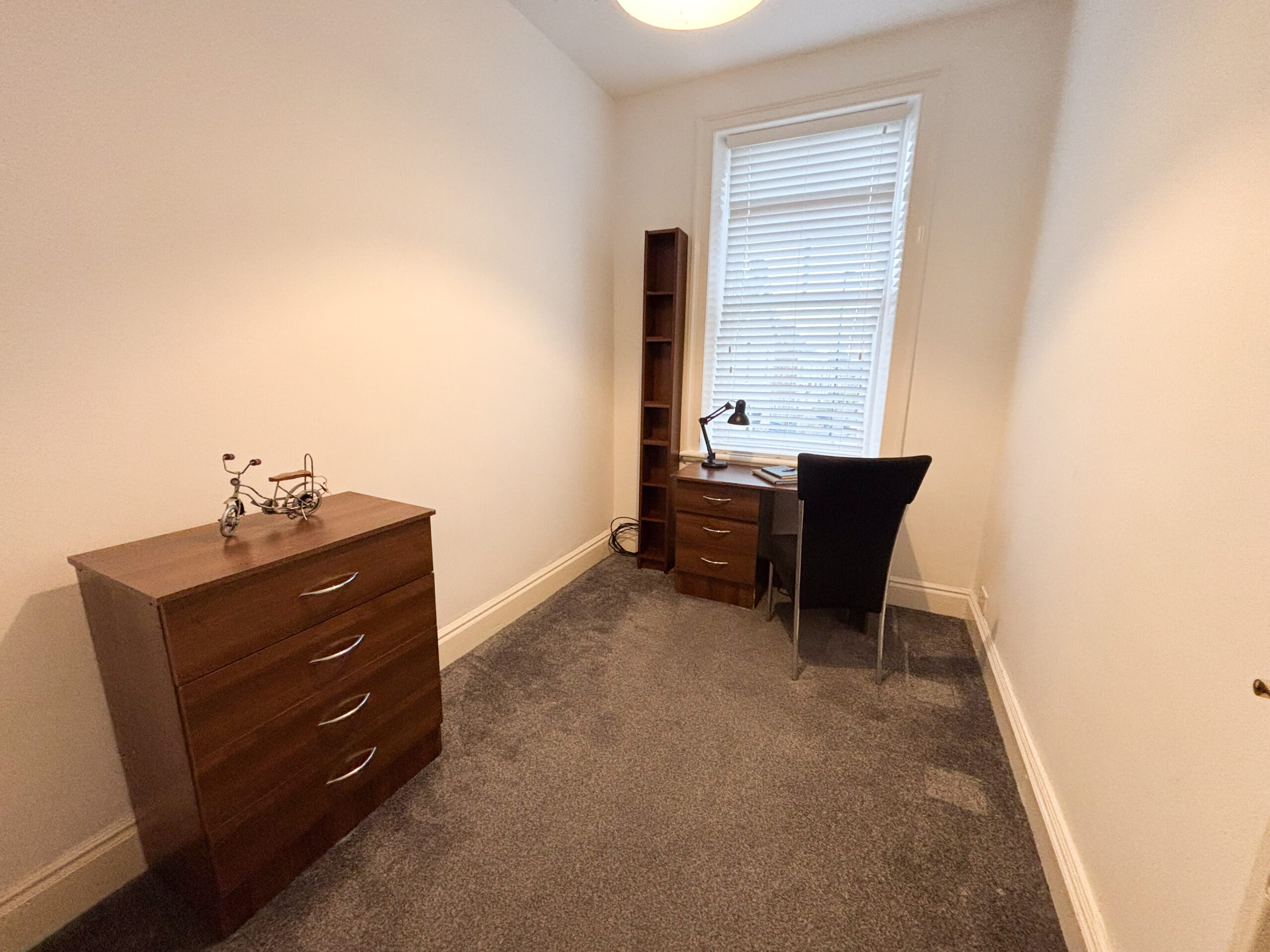 This is a small room with a window at the front of the property overlooking the front garden and is situated on the 1st floor. It contains a desk, chair, a wardrobe, chest of drawers and a small double bed. The room also has a tv aerial point.